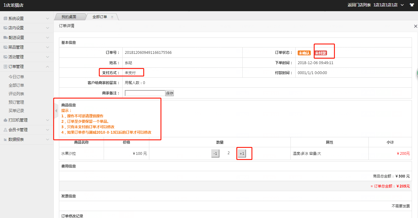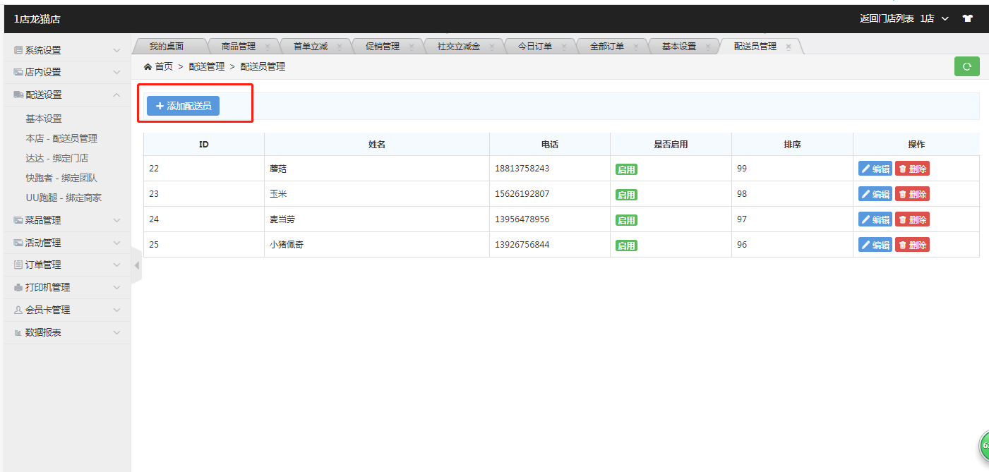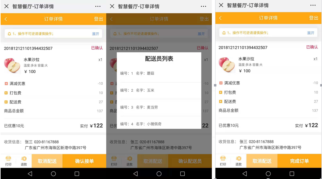 2.操作“查看”:商家可以设置配送员配送,可以确认配送完成!商家可以修改未支付订单的商品数量。