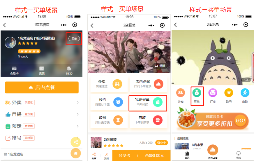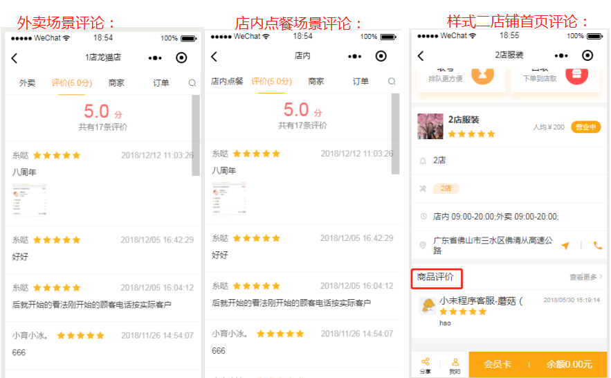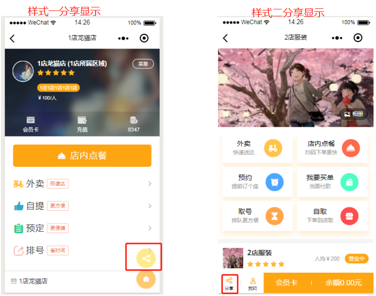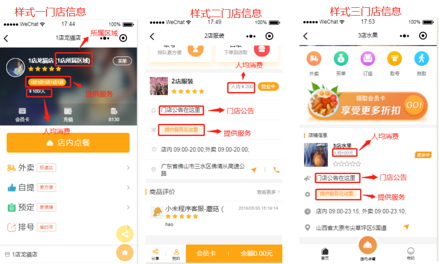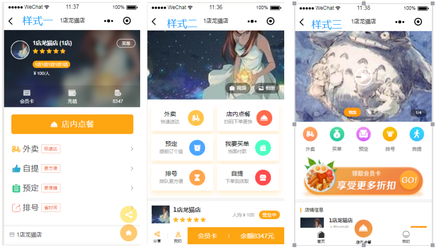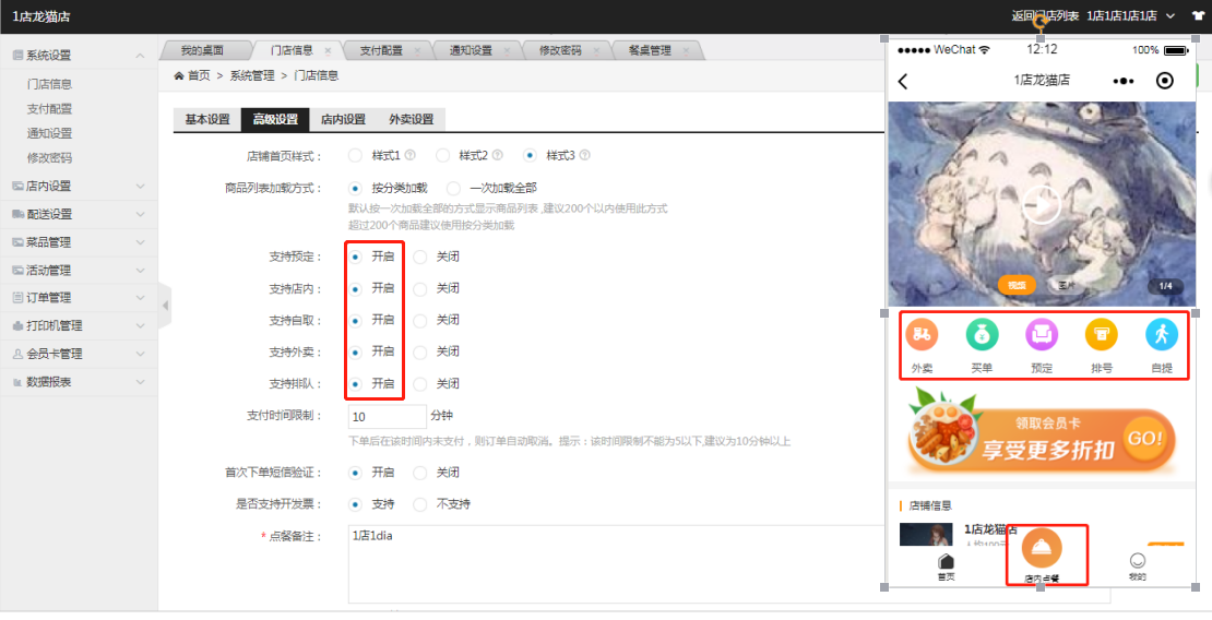 - 店铺首页展示的场景:预定,店内,自取,外卖,排队5个场景必须在高级设置里面开启了,前端才能显示。