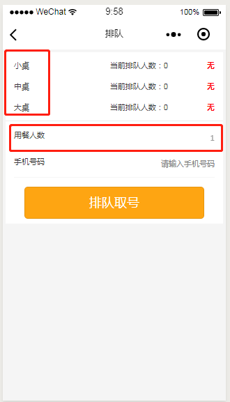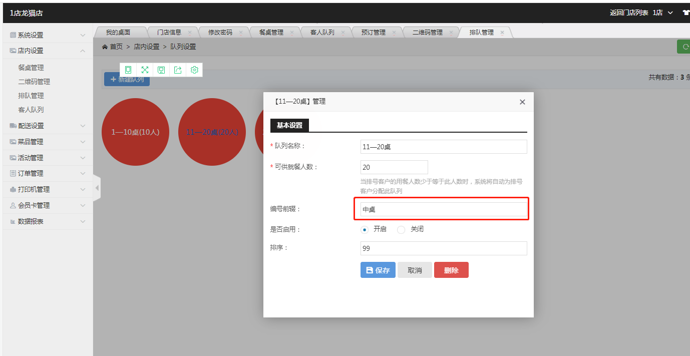 1.客人排队取号对应的是排队管理,商家先设置好排队管理,客人在前端可以排队拿号,输入用餐人数,后台自动把这个客人匹配到对应的队列里面。