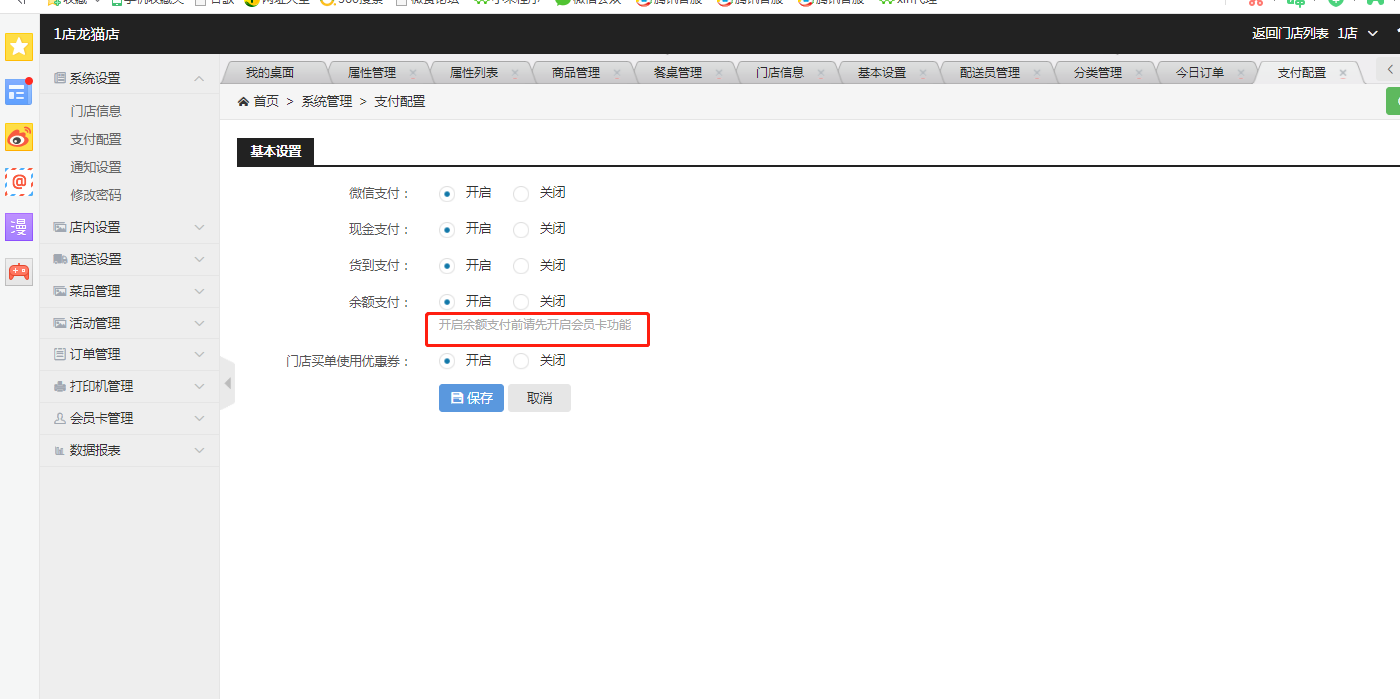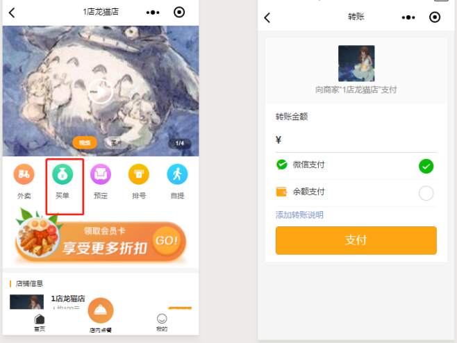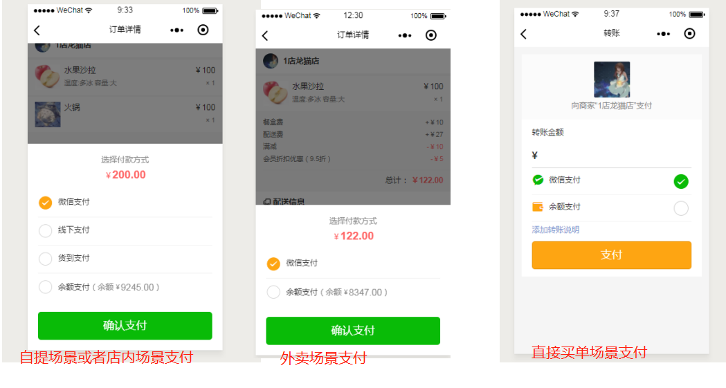 注意事项:外卖场景只有微信支付和余额支付 。店内点餐场景四种支付方式都可以使用。