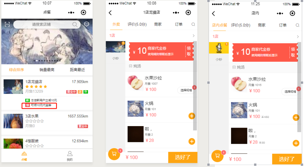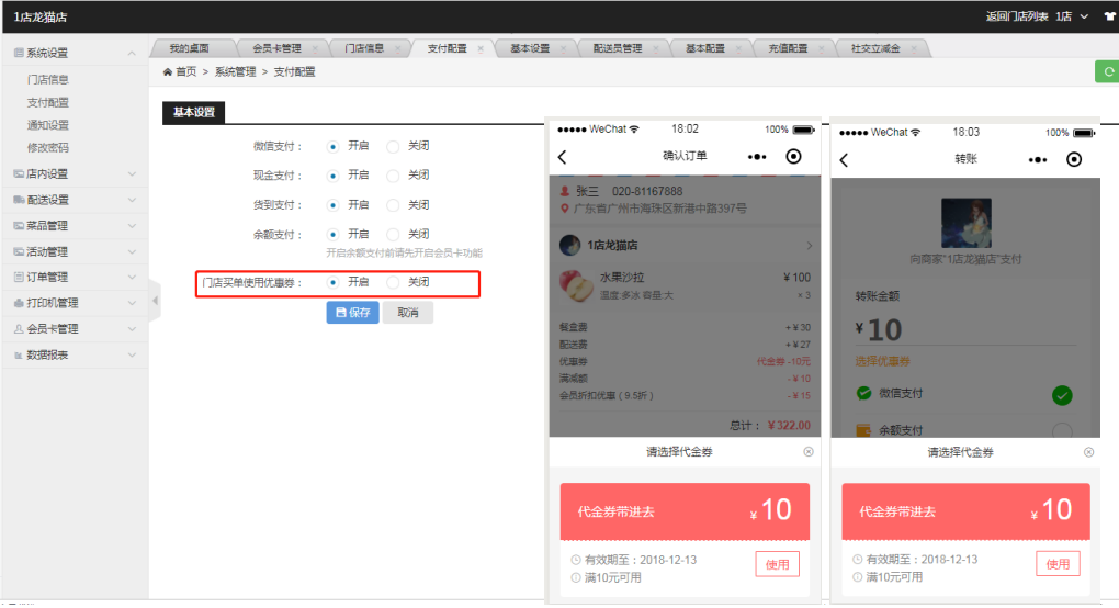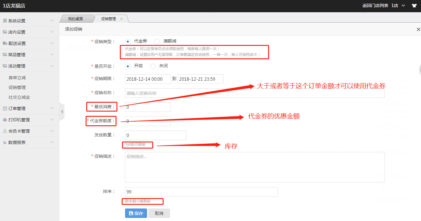 注意:代金券可以在店内点餐场景和外卖场景,自提场景显示。