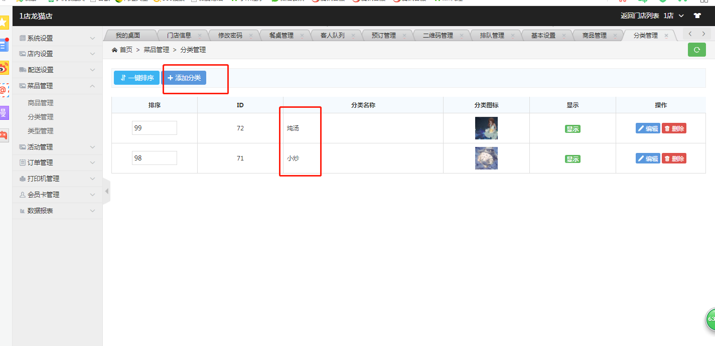1.分类管理:指的菜品的分类,比如:甜点,饮料,肉类,青菜,烧烤等等