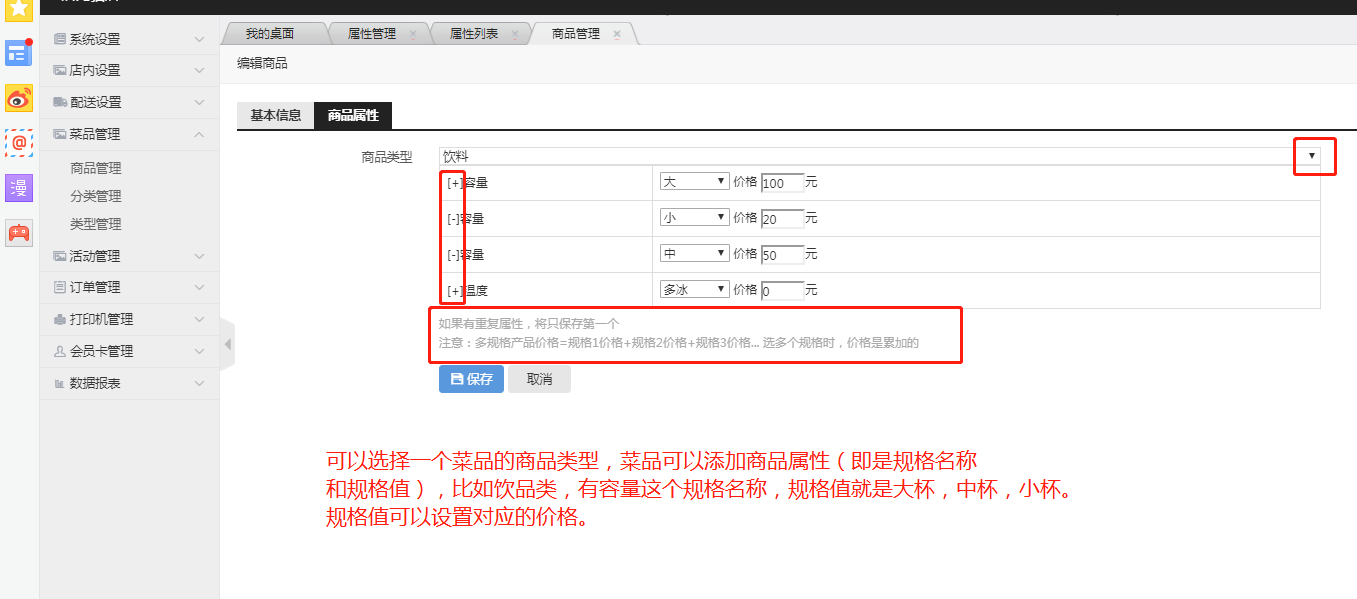 注意:记得先添加属性列表(菜品管理——类型管理——添加类型——属性列表 ),方便在商品管理里面直接选择对应的属性!!!