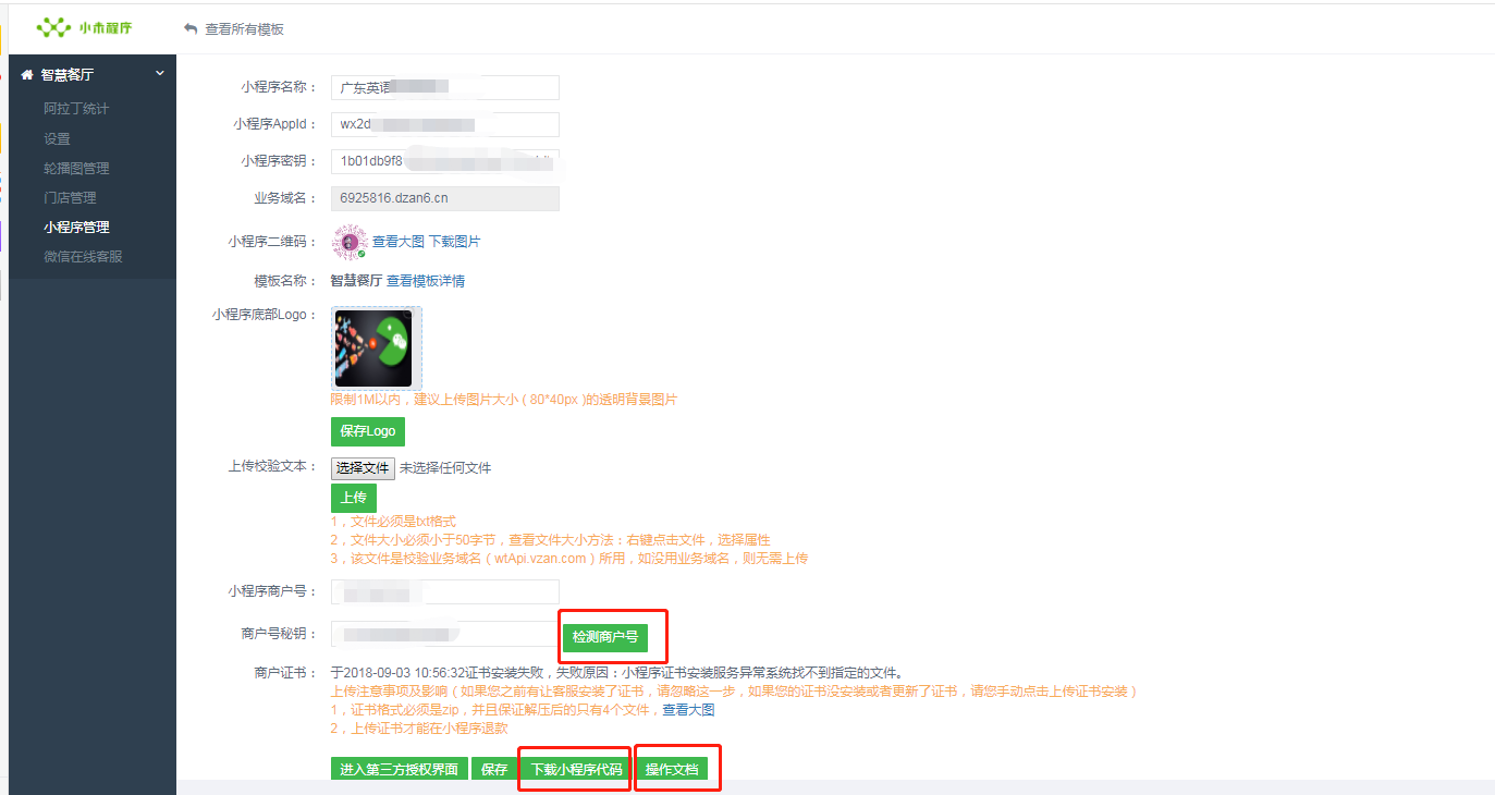 9.保存:填写好小程序名称,小程序Appid,小程序秘钥,商户号和商户秘钥后,记得保存!!!再下载小程序代码。
