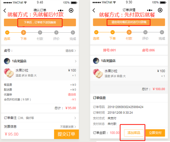 3.先就餐后付款场景:消费者可以在订单详情页添加菜品。