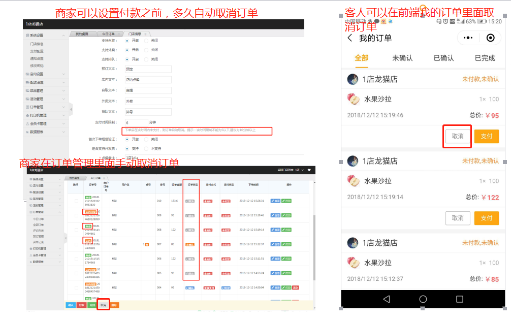 3.取消订单:当订单为外卖、自取、店内(先付款后吃饭)时,如用户不进行支付,则订单超时会自动取消,无需处理。