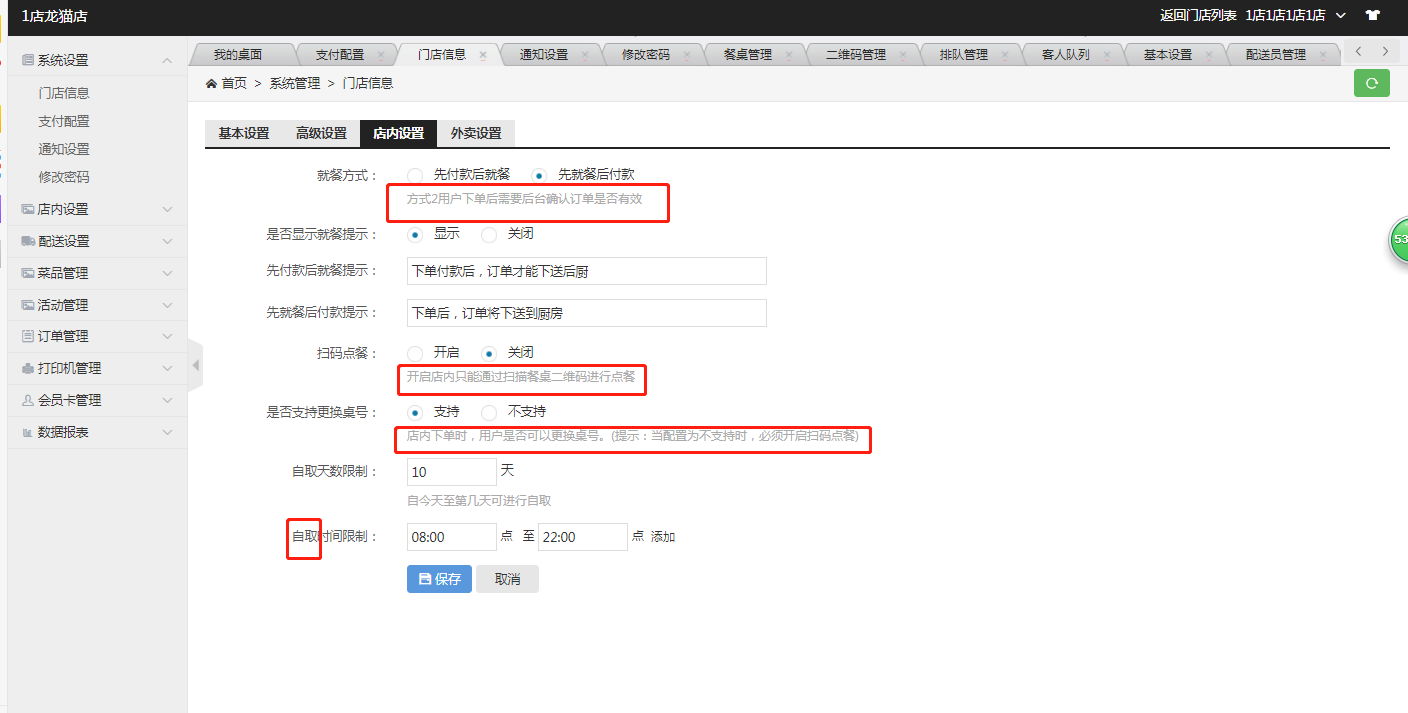 1.就餐设置:在店内点餐场景中,可以选择先就餐后付款,或者是先付款后就餐。