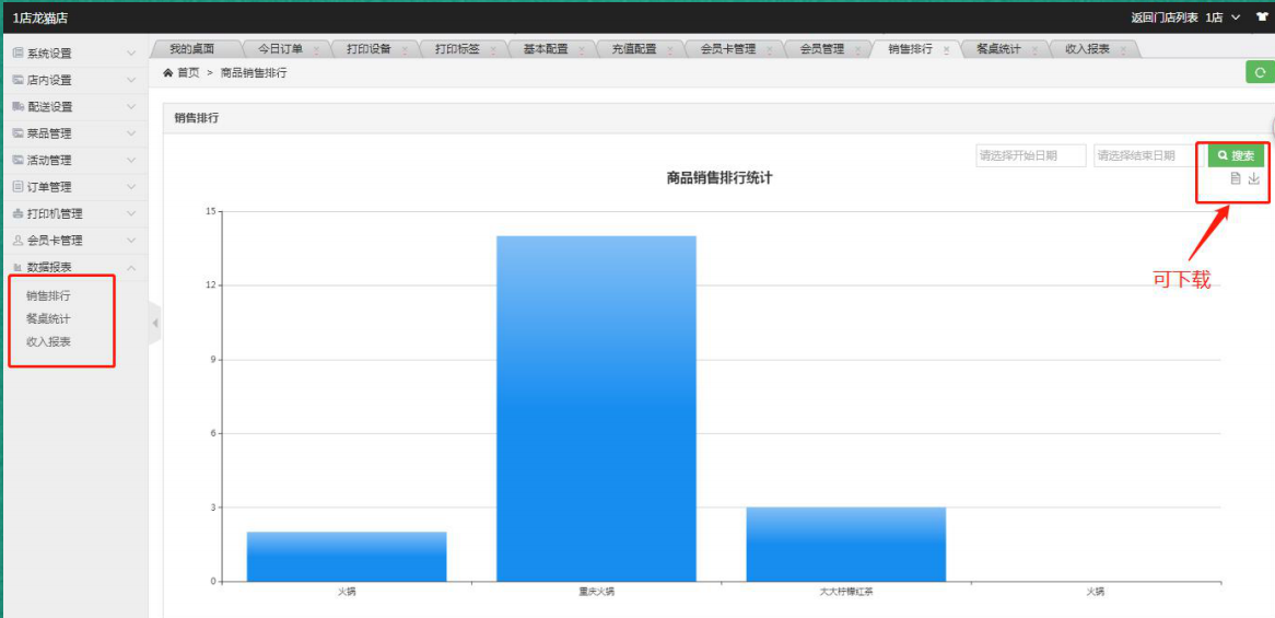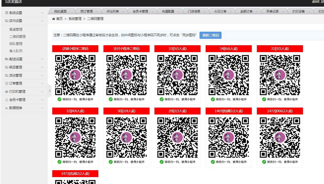2.餐桌二维码跟餐桌管理相对应,先设置好餐桌管理,这里可更新餐桌二维码,用于扫码店内点餐场景。