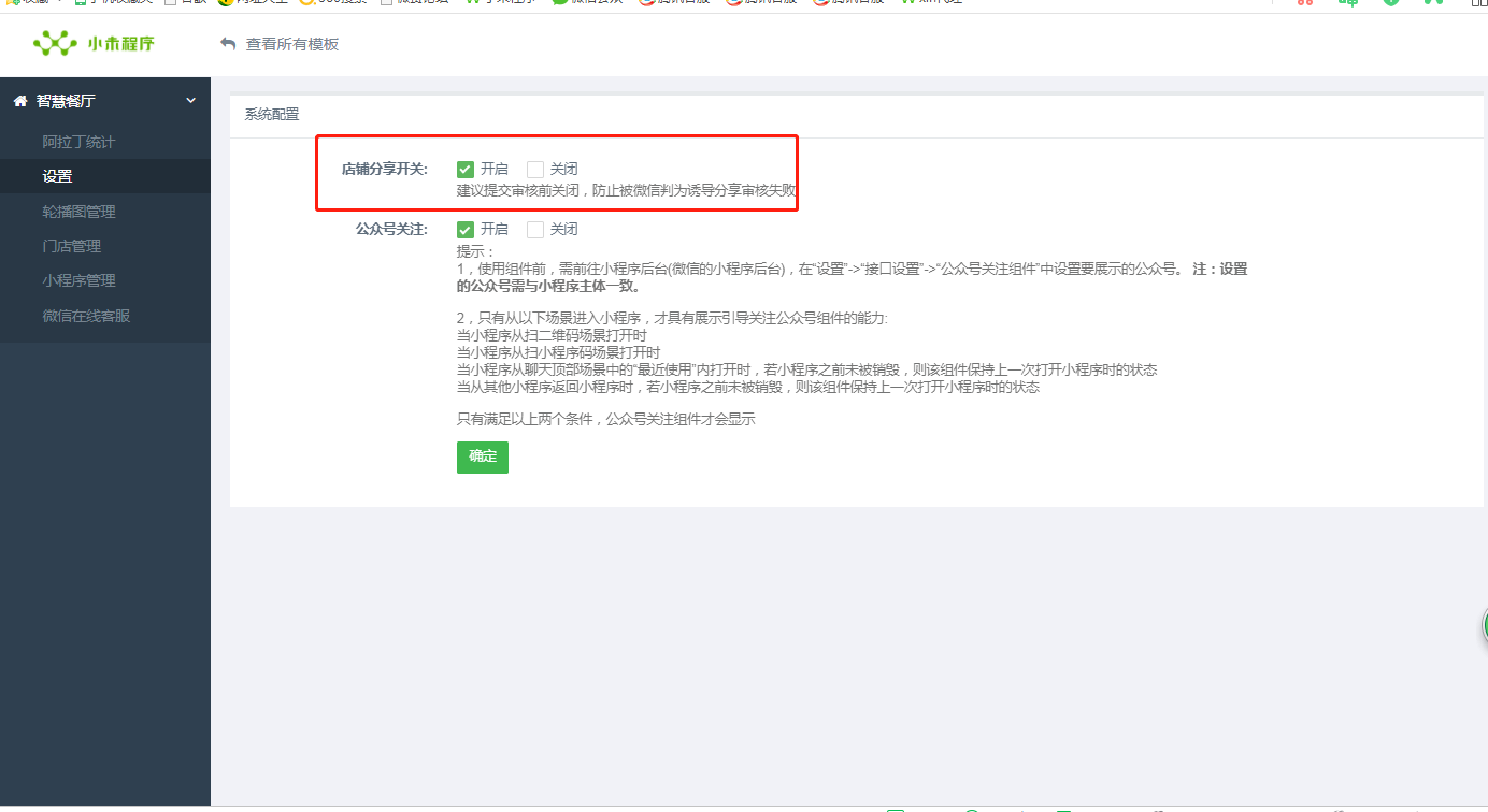 操作步骤:模板后台开启——手机端小程序里面进入到店铺首页可以查看