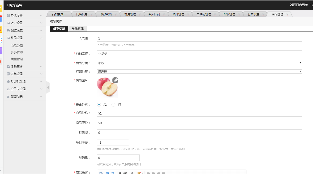 4.在菜品管理——商品管理——基本信息——是否外卖(选择“是”! ! !)