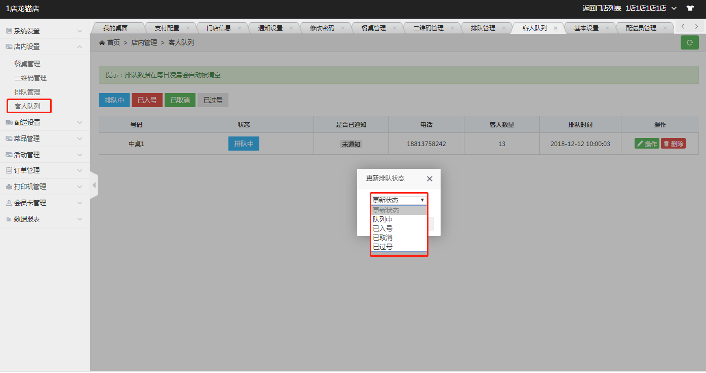 2.商家可在后台更新状态。客人可以排队取号后,可以在前端操作“刷新排队”或者“取消排队”。