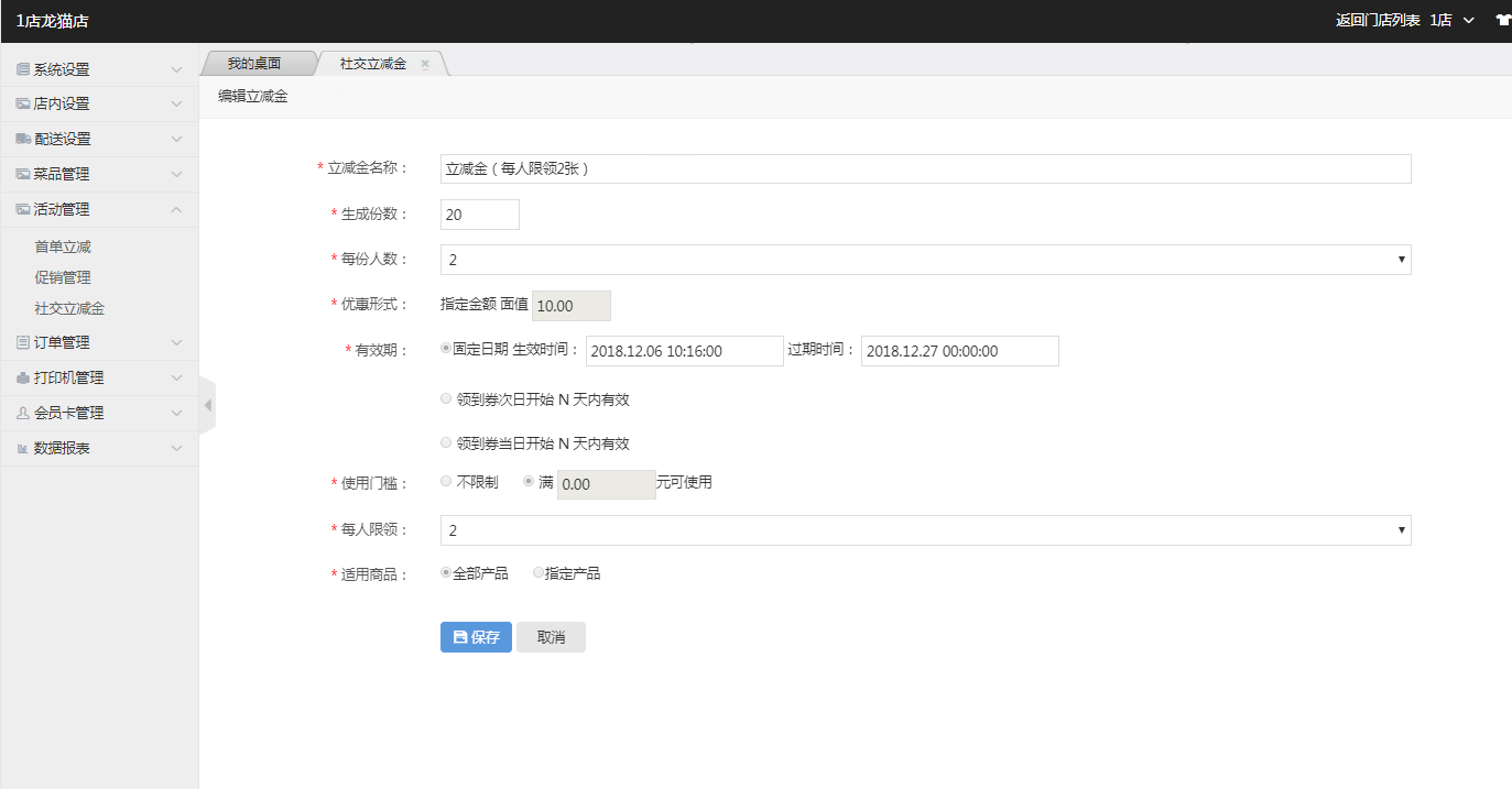 3.每人限领:同一个人可以领取的立减金数量。比如,消费了两次,同一个可以在两次消费中都可以领取立减金,第三次消费之后就会显示“您已经超过领取限制”