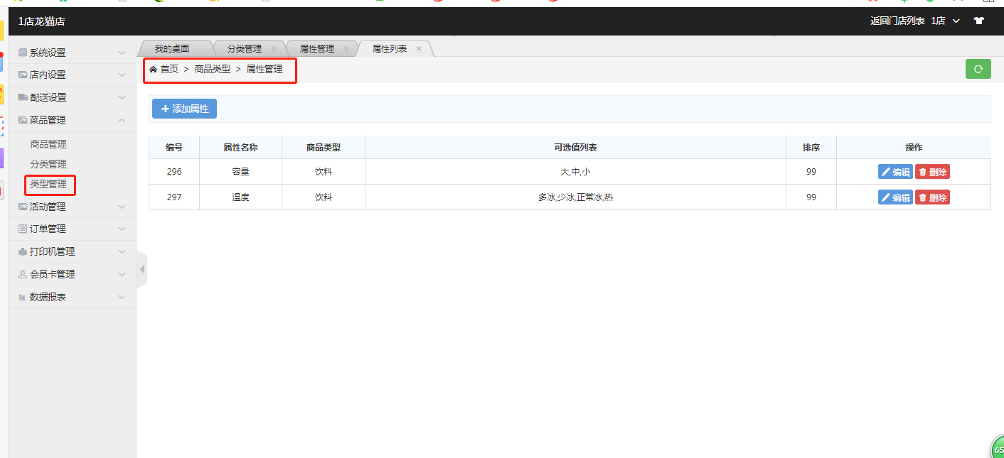 类型管理可以添加每一种商品类型对应的属性。比如饮料这种商品类型,对应的属性名称有:容量,温度等等。容量属性名称对应的可选值列表为 大杯,中杯,小杯等等。