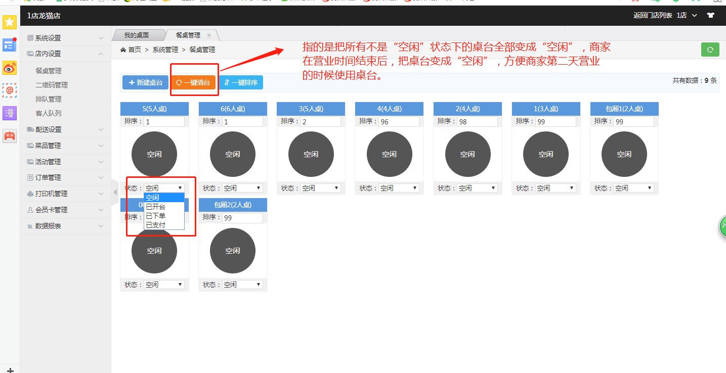 1.新建桌台:可以添加桌台名称,可供就餐人数和排序。桌台的状态商家可以修改“空闲”“已开台”“已下单”“已支付”。