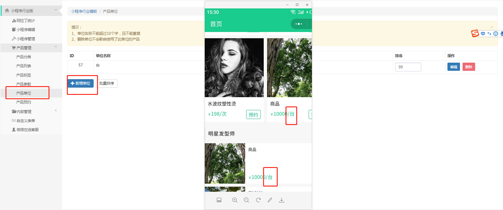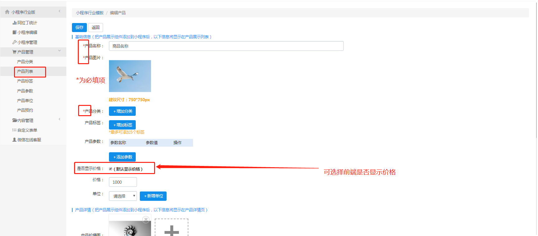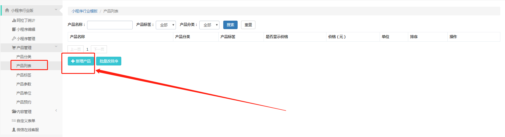 设置好产品分类、标签、参数和单位,最后在产品列表这里添加具体的商品信息
