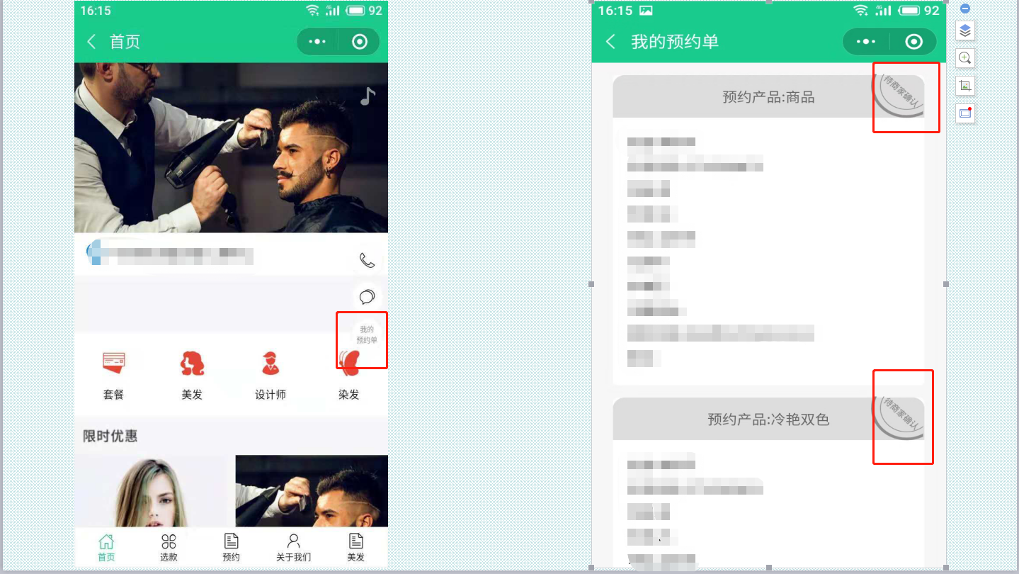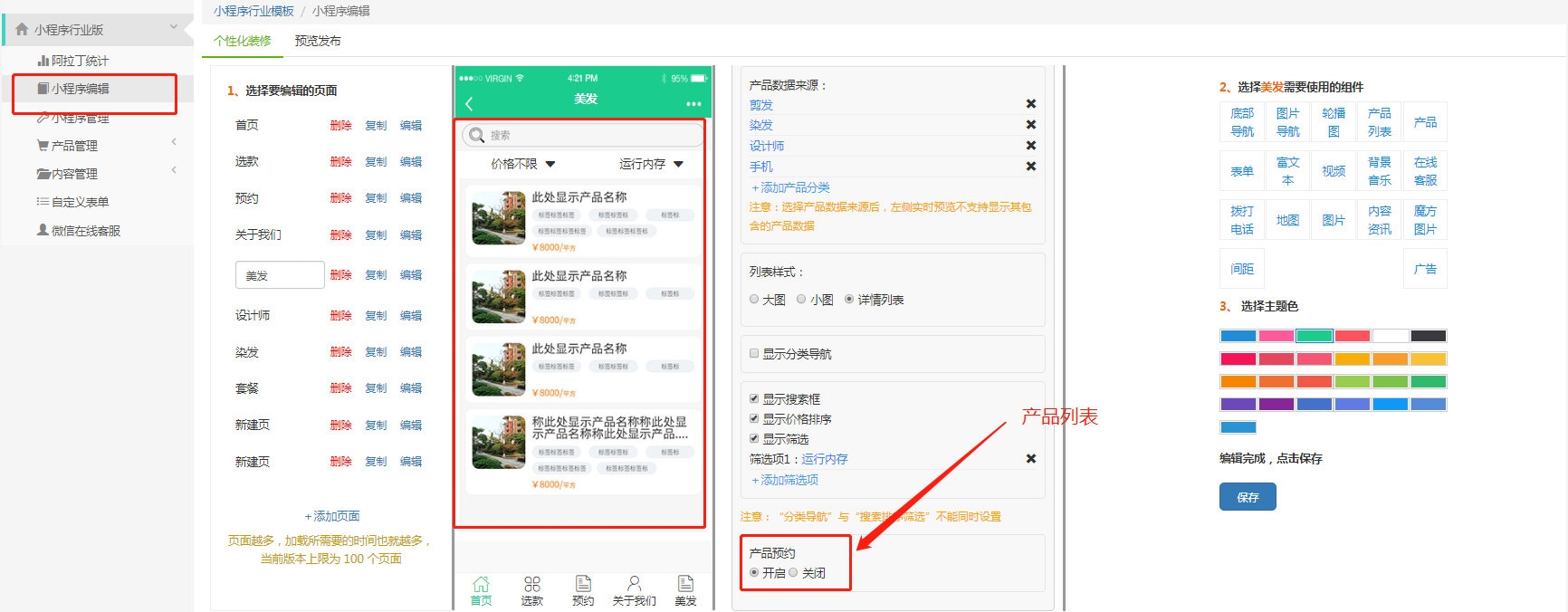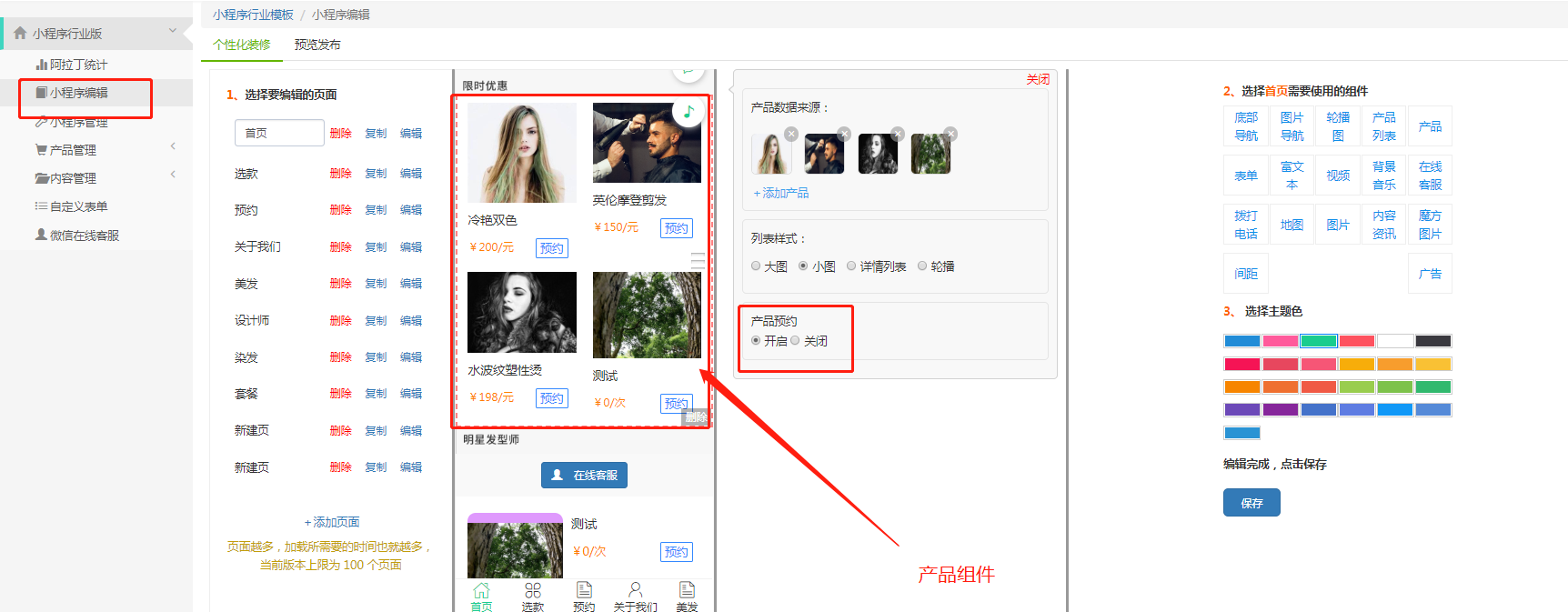产品组件和产品列表组件,在编辑页面可以设置是否可以预约,如果选择了预约,所有的产品预约信息会显示在产品预约这里,并且在后台处理预约