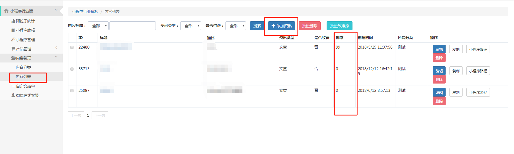 不设置排序,按添加时间来显示,后添加的显示在最前面。设置排序,数字越大显示越前