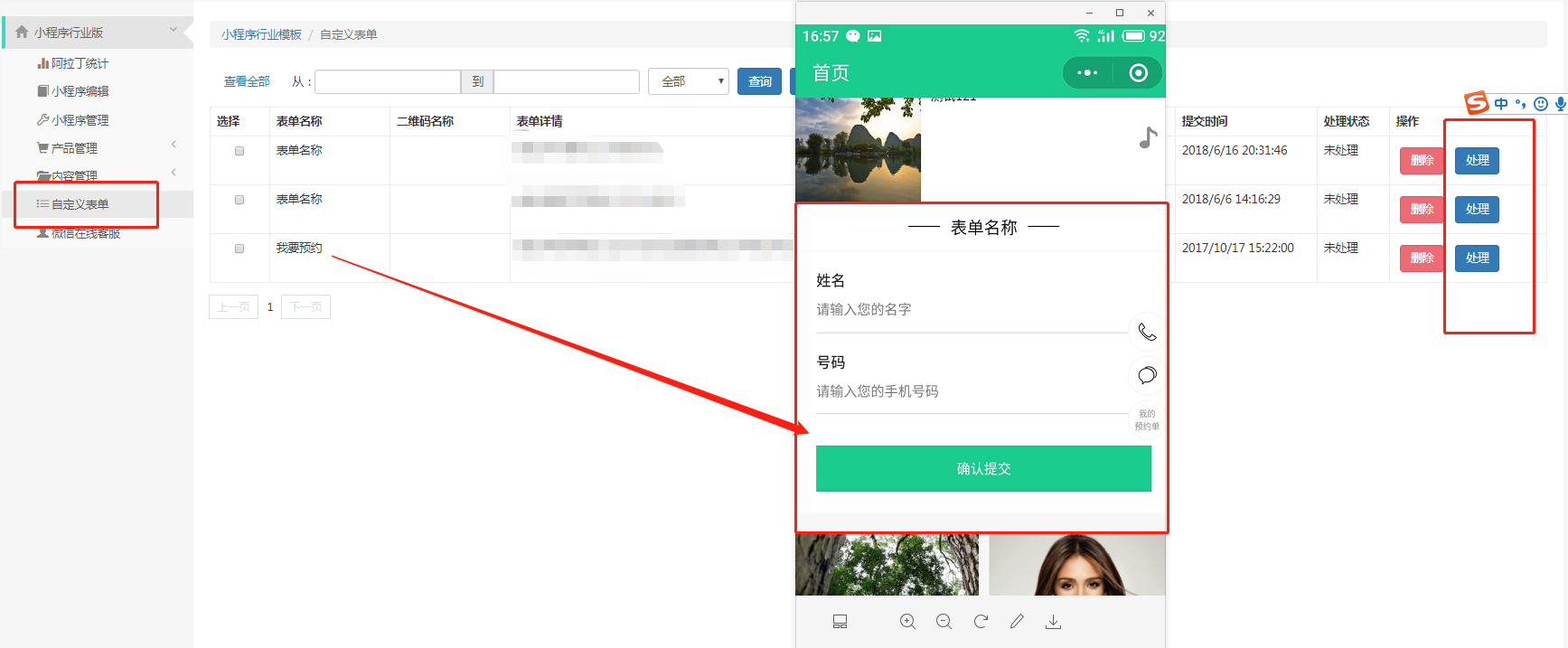 在界面那里设置的表单,别人提交的信息都会在自定义表单这里