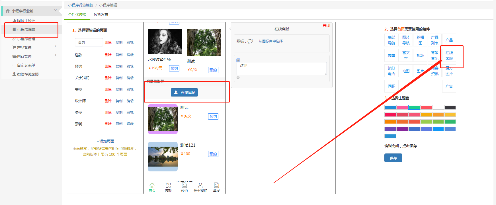 在小程序编辑那里添加“在线客服”组件