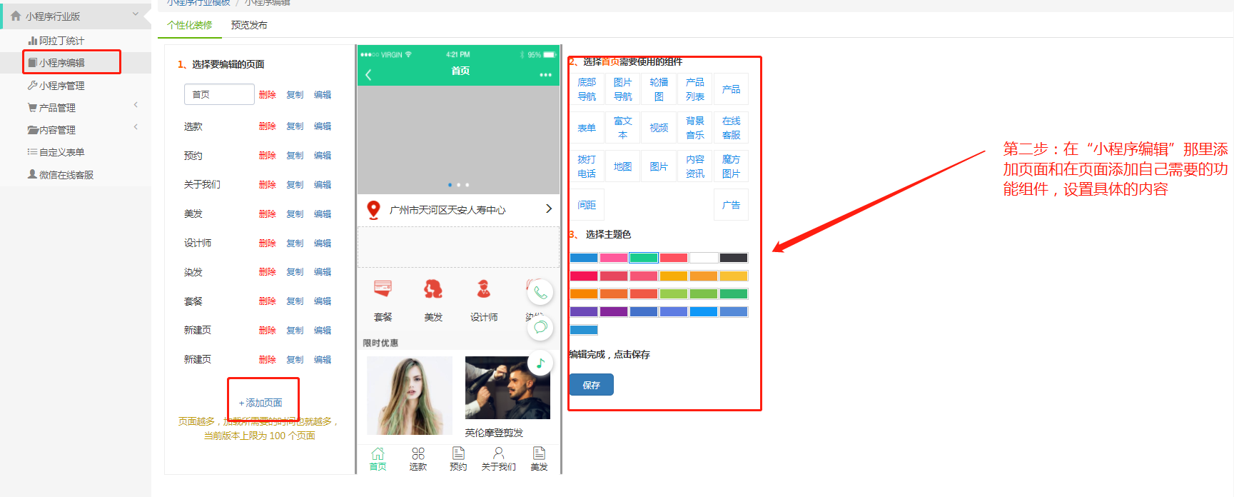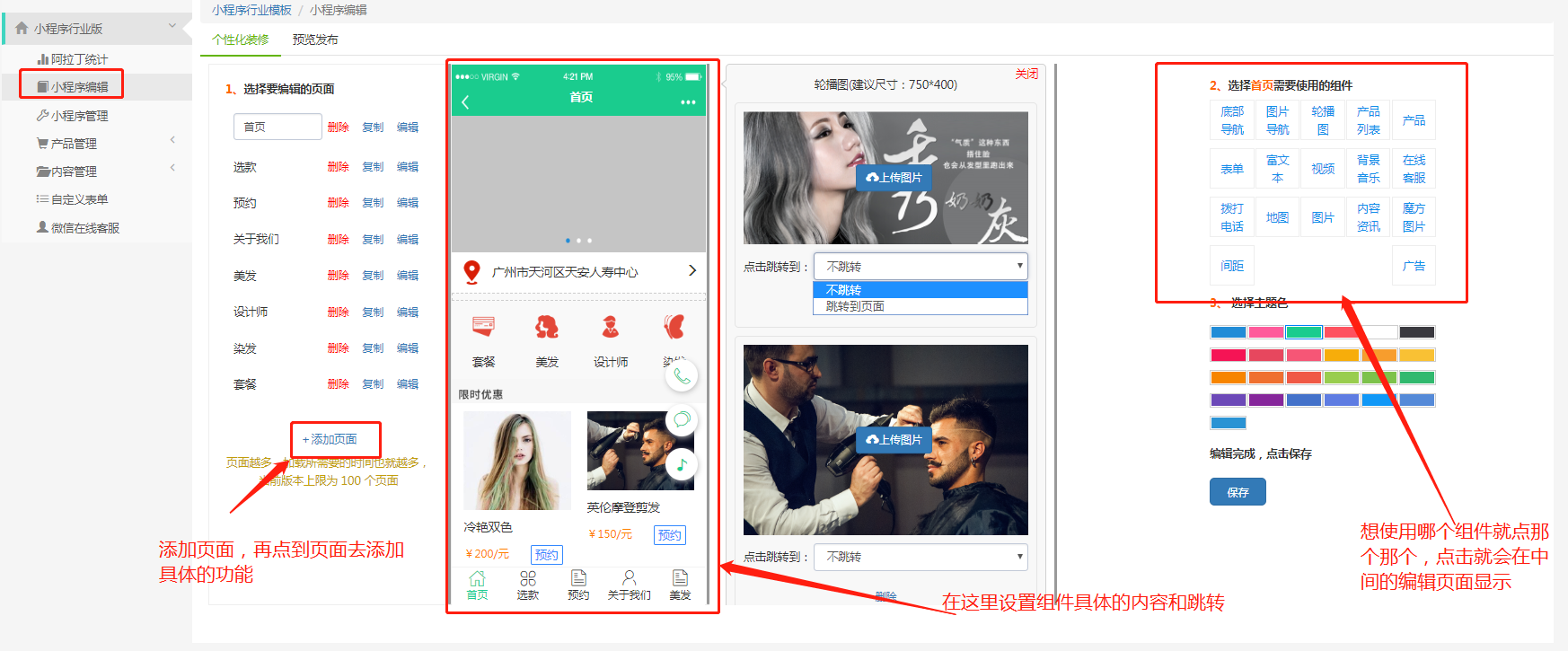 行业版:先设置左边的具体功能内容。之后再去小程序编辑那里操作添加页面和编辑页面的具体内容,最后再去发布