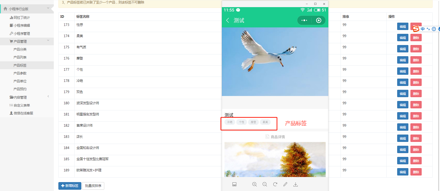 产品标签:标签是对一个商品的描述,正常可以是一个形容词。比如“时尚风格”“简洁而有型”等。设置的标签会显示在商品详情页中商品名称下面