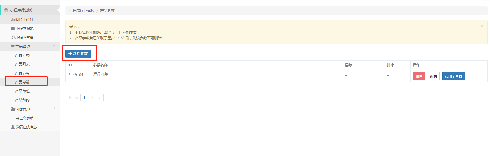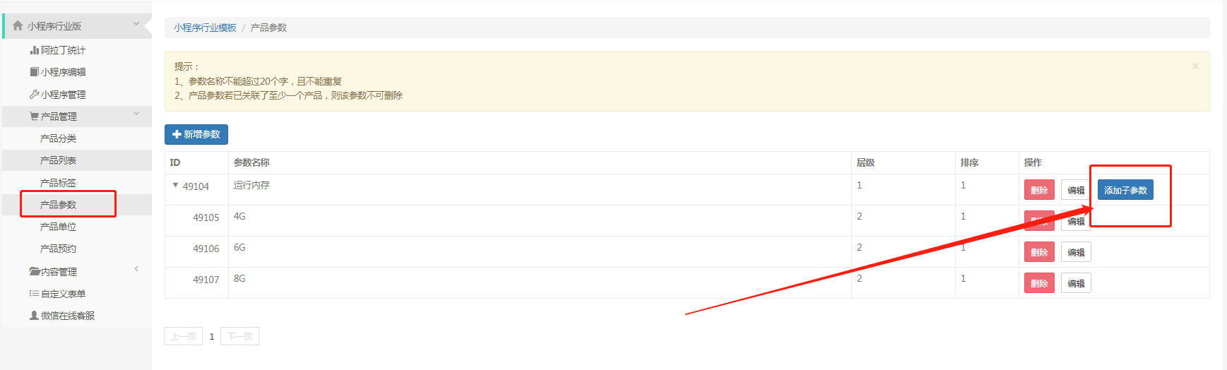 产品参数用在产品列表中的筛选那里。参数在产品列表那里可以理解为一种要求,比如手机运行内存8G/6G/4G,可以通过选择这个要去,把所有符合这个要求的商品筛选出来(先添加参数名称再添加该参数下具体的子参数)