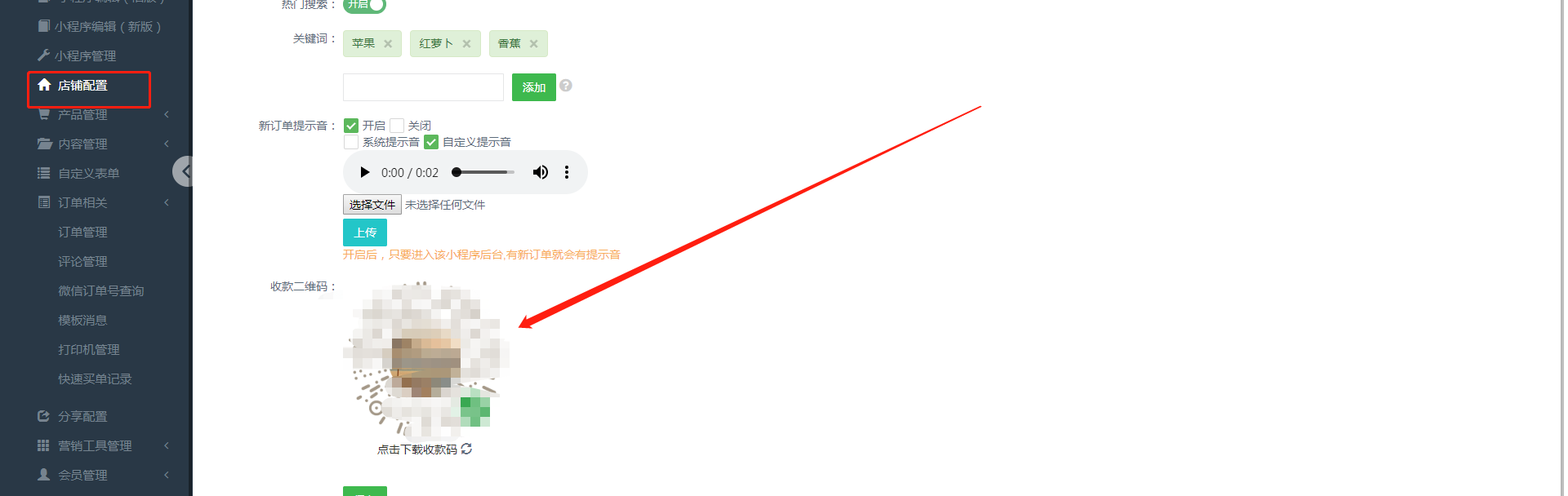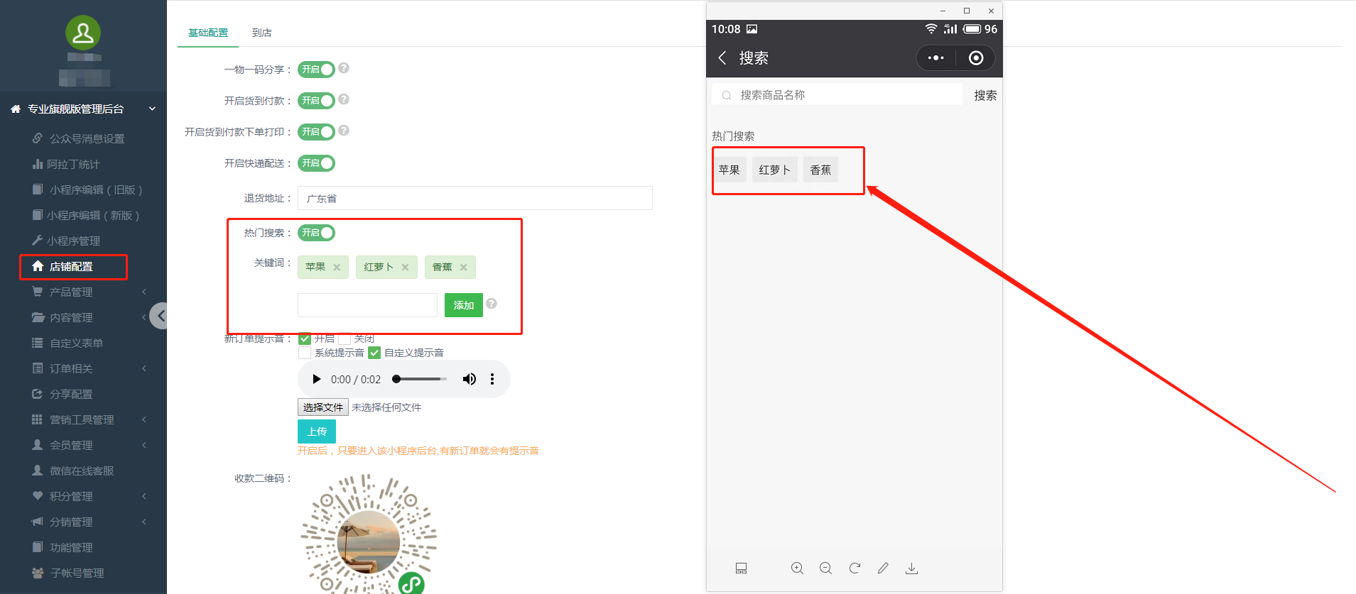 热门搜索开启,设置好热词。这些热词在使用“搜索组件”时,搜索框下方就会显示热词。这些热词可以是热销商品的名称,有助于商品的销售(注意:最多可以添加20个关键词)