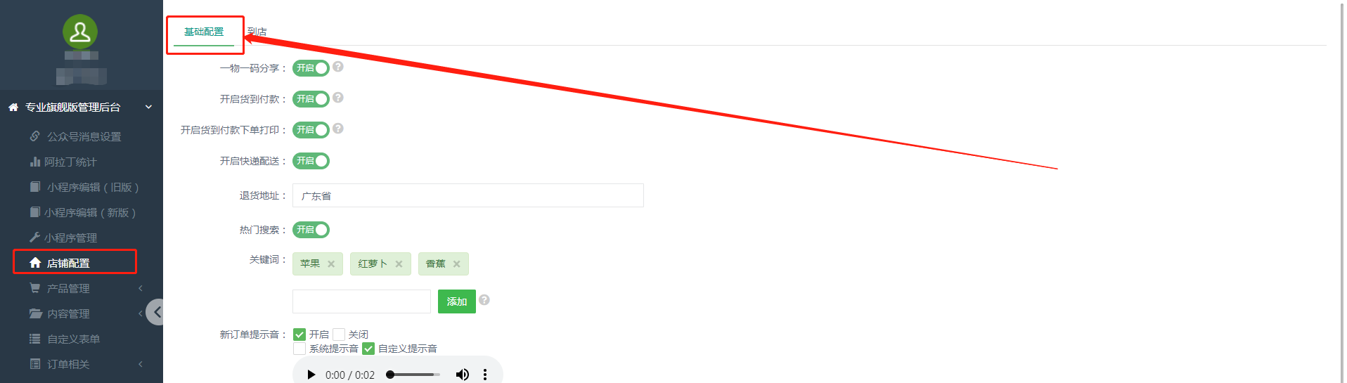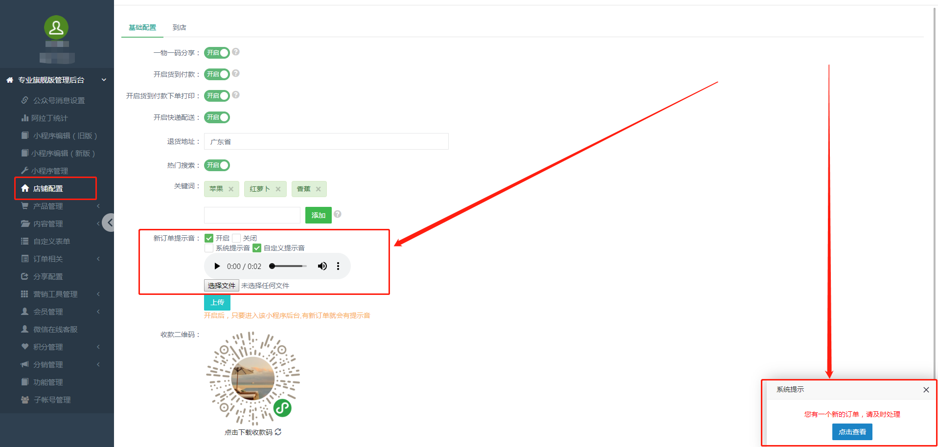 电脑登入模板后台,当小程序有订单时,电脑会播放提示音也会弹出一个有订单的提示。提示音可自定义也可使用系统提示元