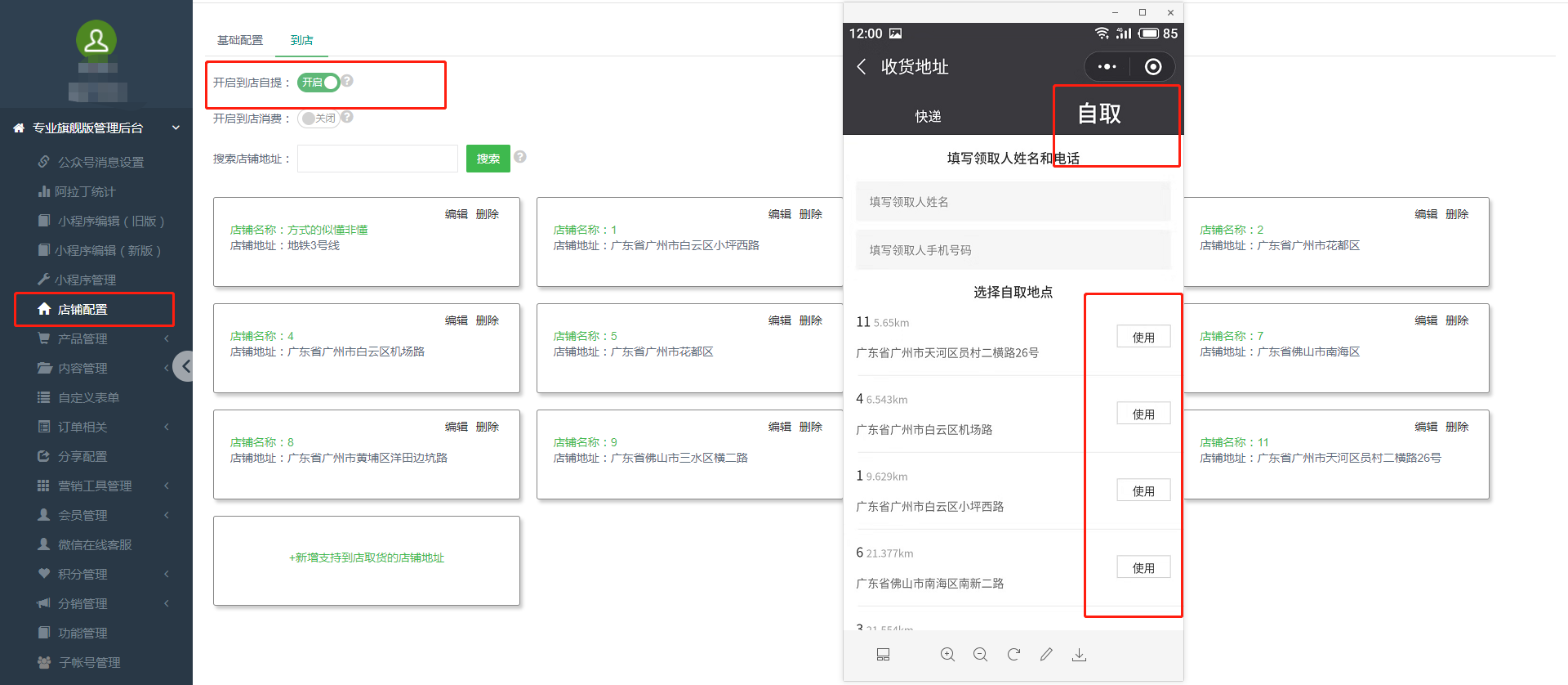 想使用“到店自提”功能,先需要设置好下方的店铺地址。线下门店地址限制在100个以内。设置好之后别人在小程序里面下单时,就可以选择自取,自取的时候选择店铺(注意:只针对普通商品以及拼团,秒杀和砍价暂不支持)