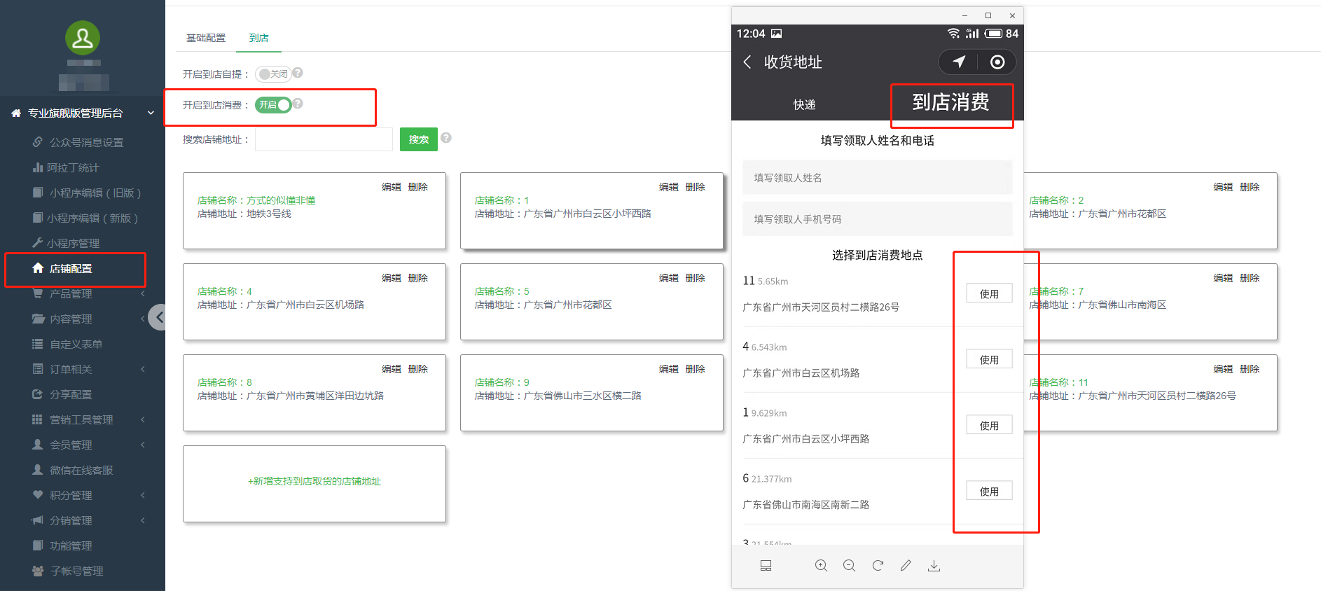 到店消费和到店自提是一样的,先设置好线下店铺地址,之后别人在小程序上面下单时可选择到时去哪家店铺消费