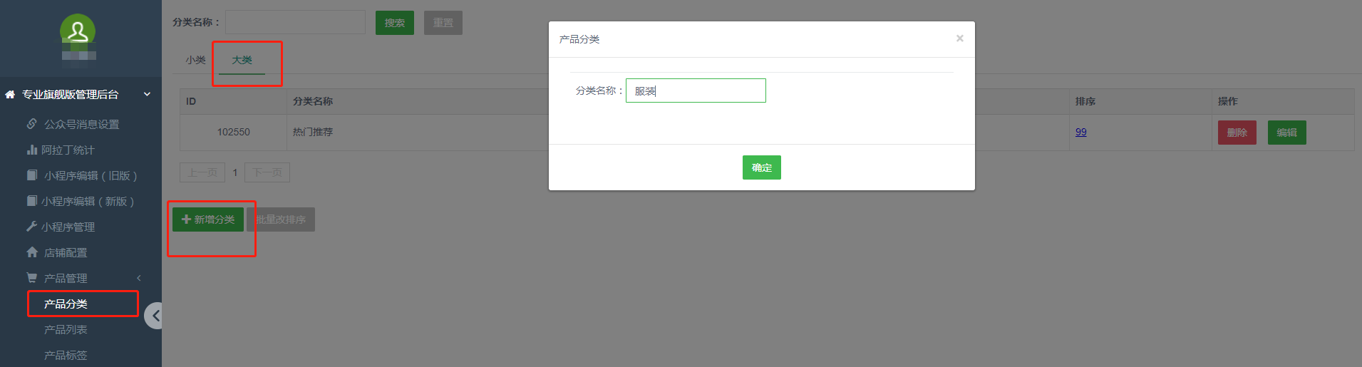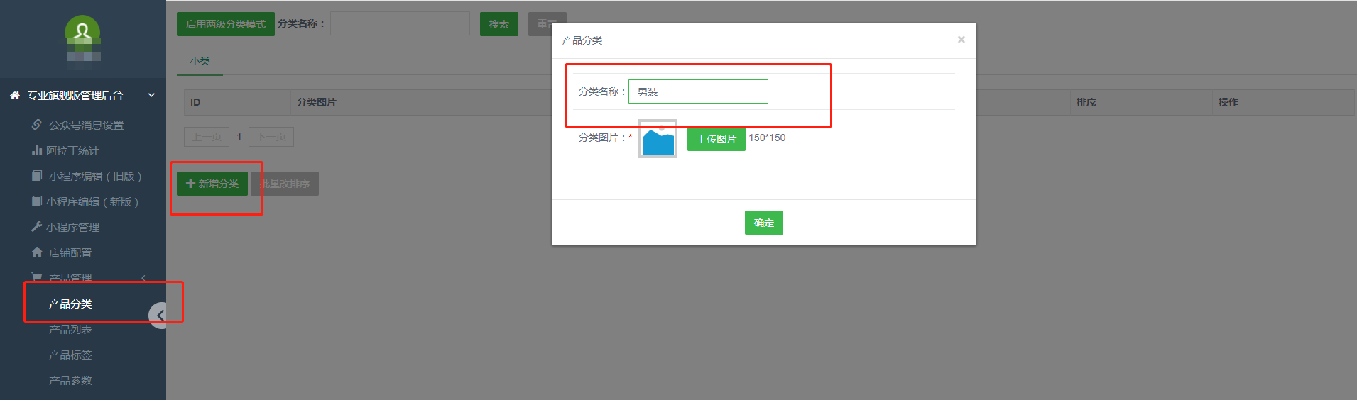 二级分类:需要先启用二级分类,先设置大类,再设置具体的小类(比如:大类为衣服,具体的小类就是男装和女装)