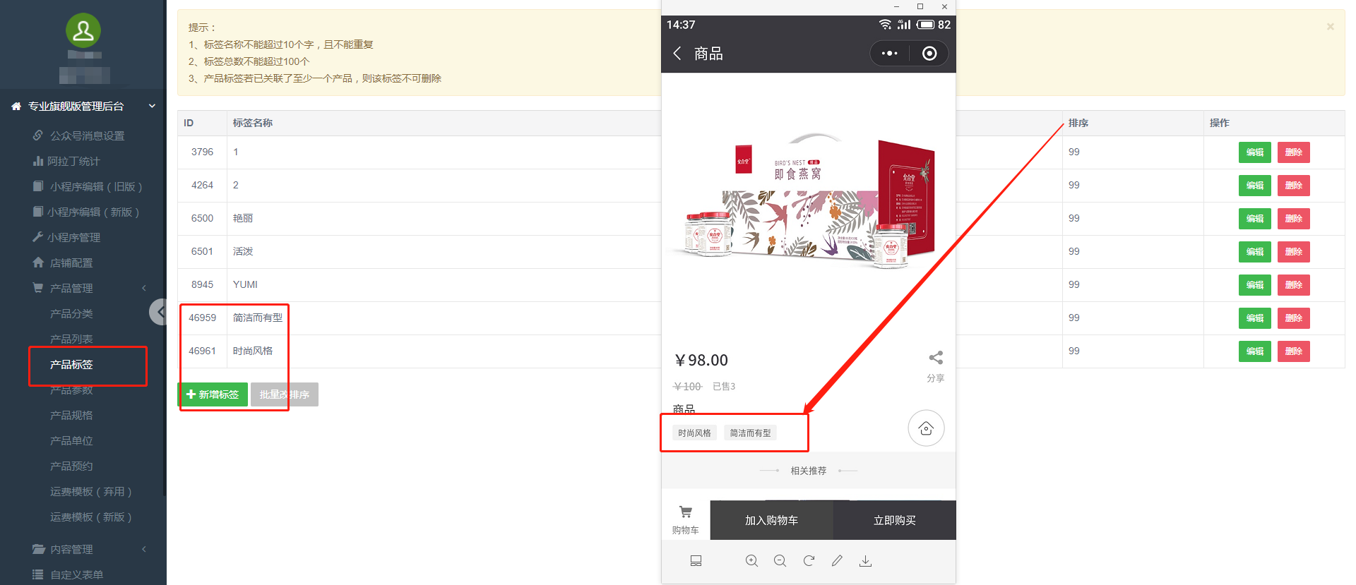 产品标签:标签是对一个商品的描述,正常可以是一个形容词。比如“时尚风格”“简洁而有型”等。设置的标签会显示在商品详情页中商品名称下面