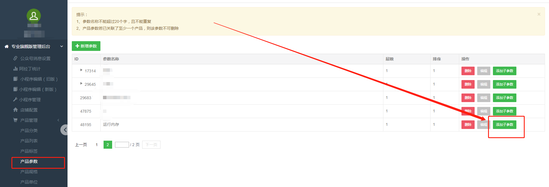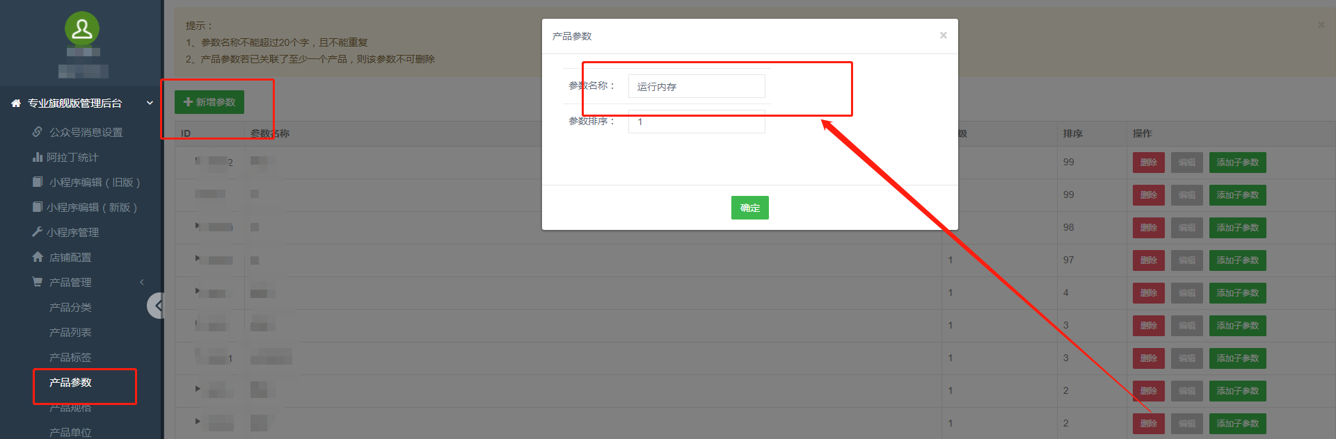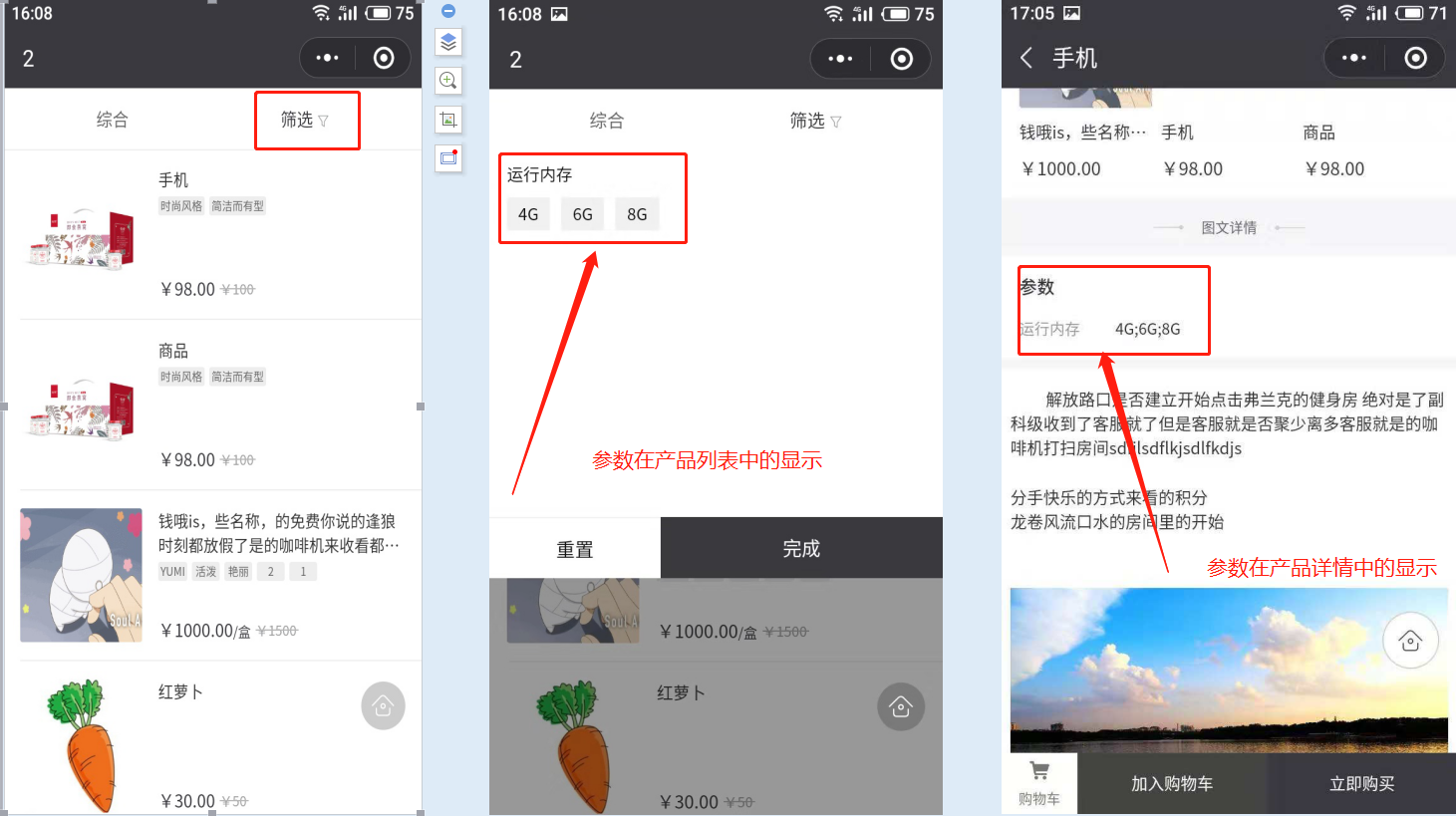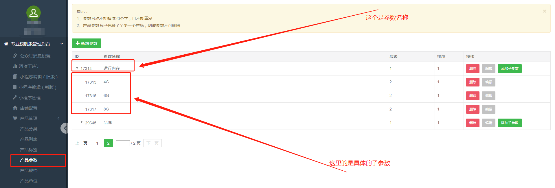 产品参数用在产品列表中的筛选和显示在商品详情页那里。参数在产品列表那里可以理解为一种要求,比如手机运行内存:8G/6G/4G,可以通过选择这个要去,把所有符合这个要求的商品筛选出来(先添加参数名称再添加该参数下具体的子参数)