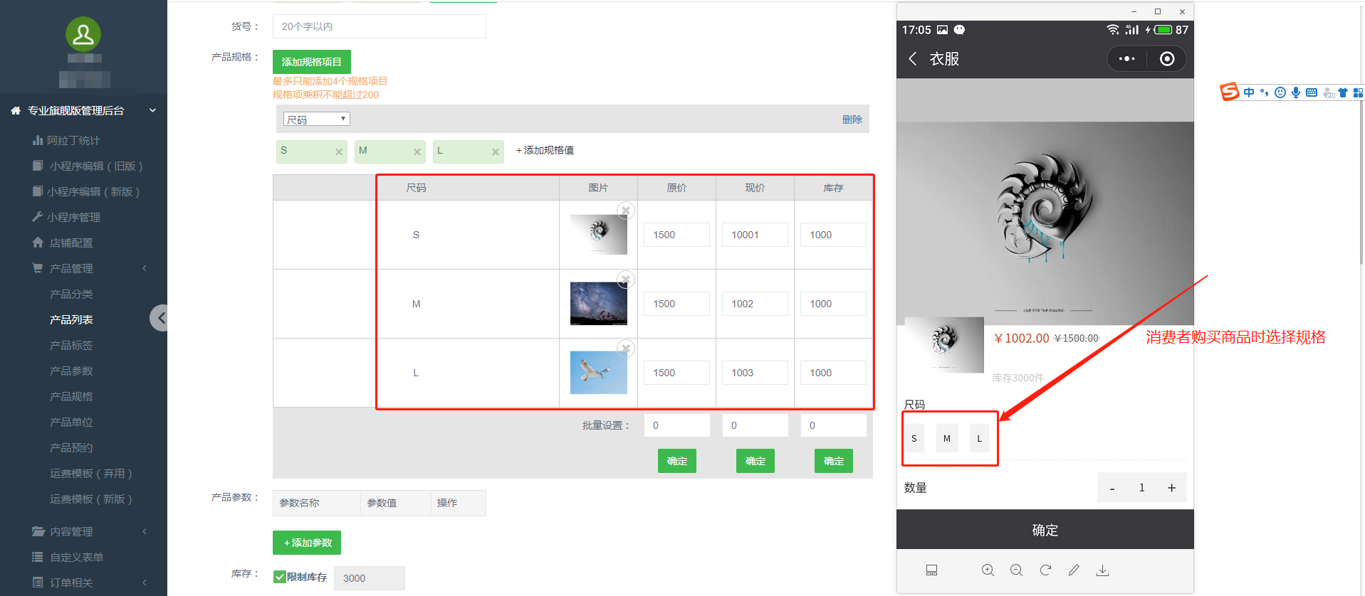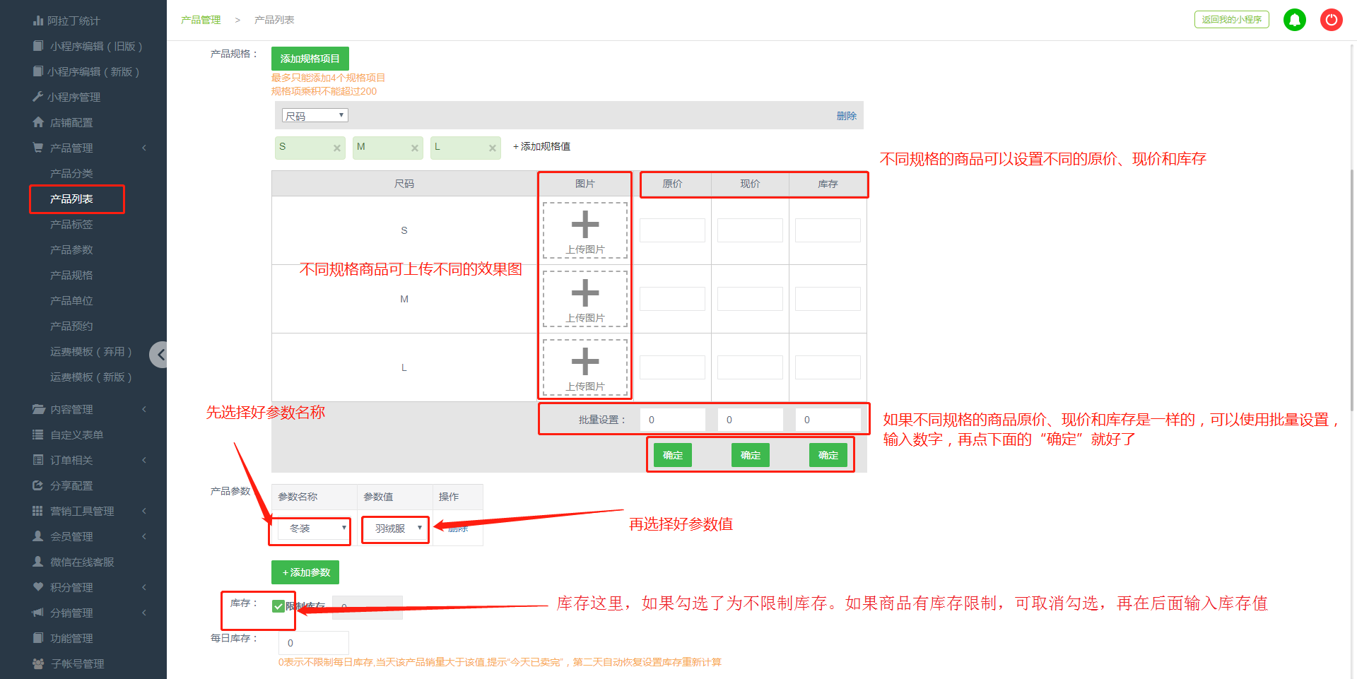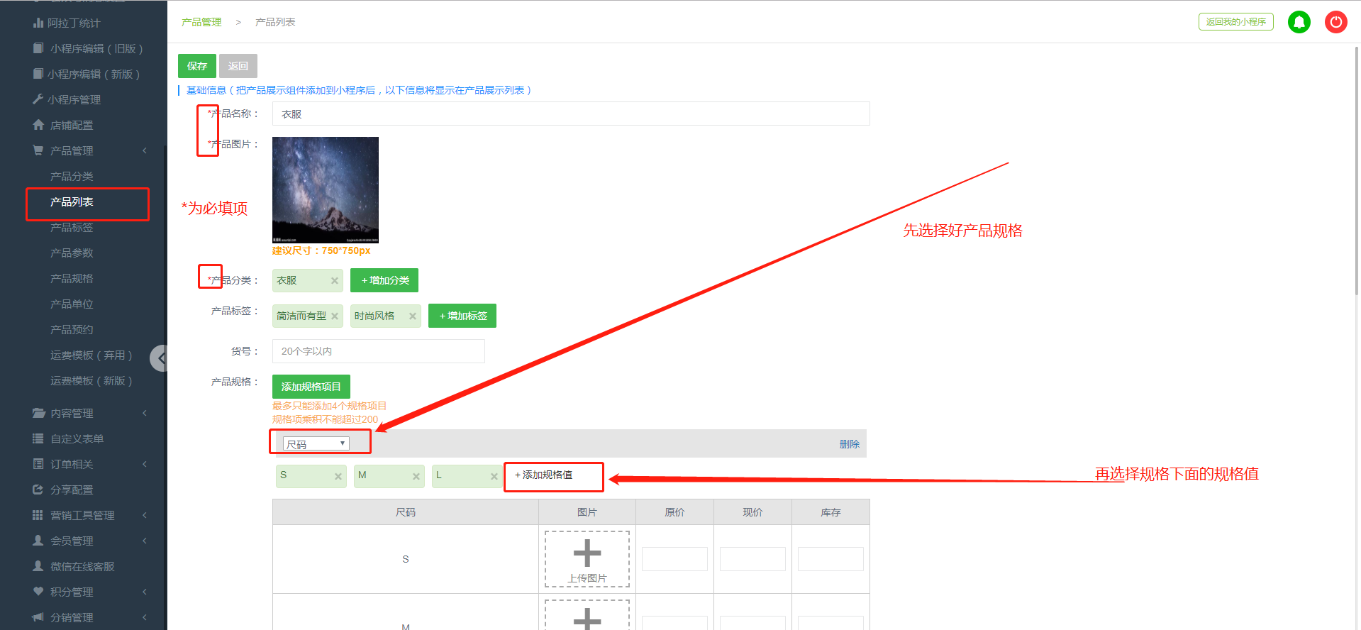 产品规格:如衣服的尺码不同,可设置一个规格名称为:尺码 其规格值为S,M,L