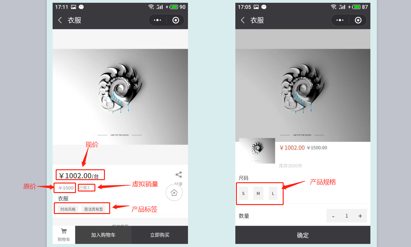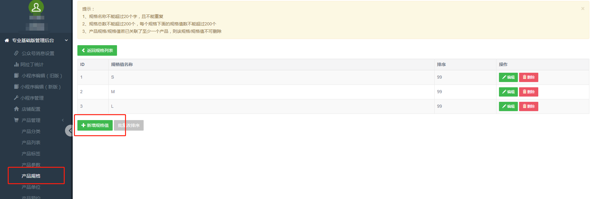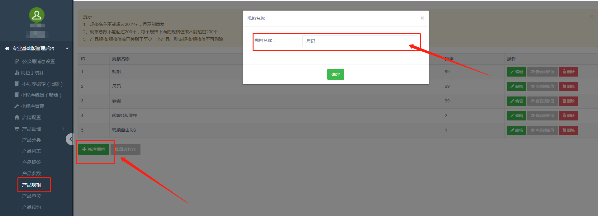 产品规格:如衣服的尺码不同,可设置一个规格名称为:尺码 其规格值为S,M,L