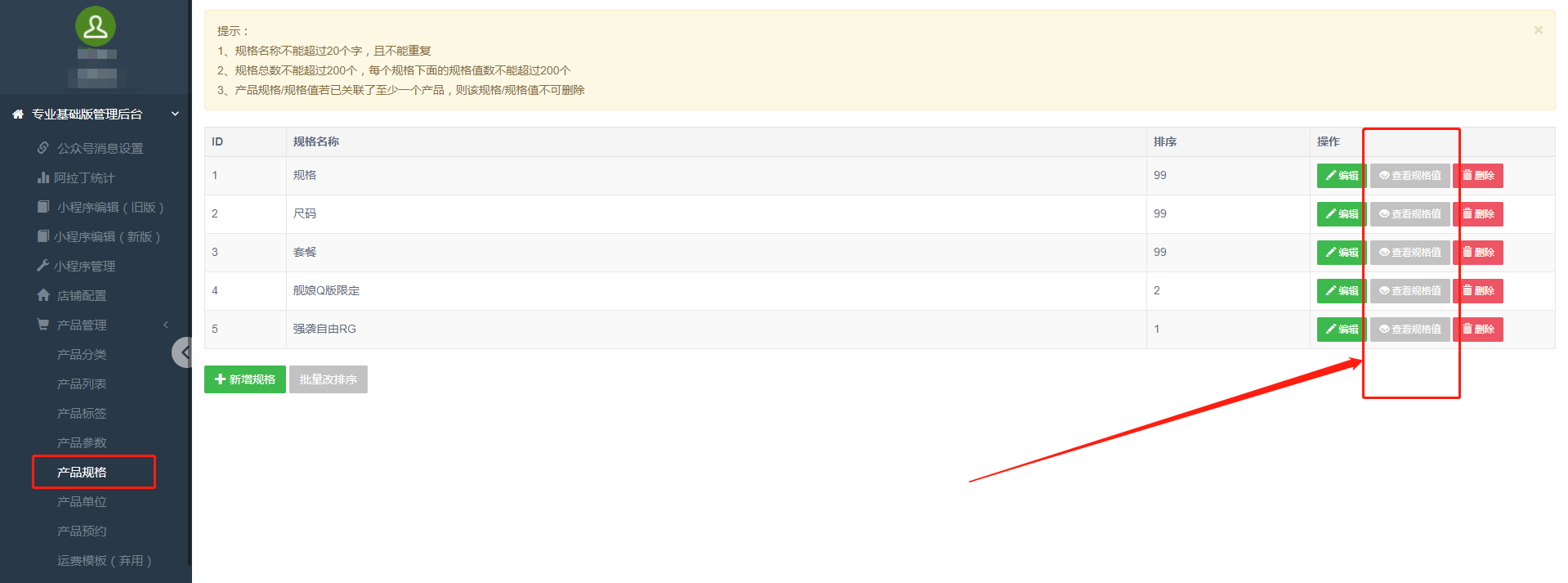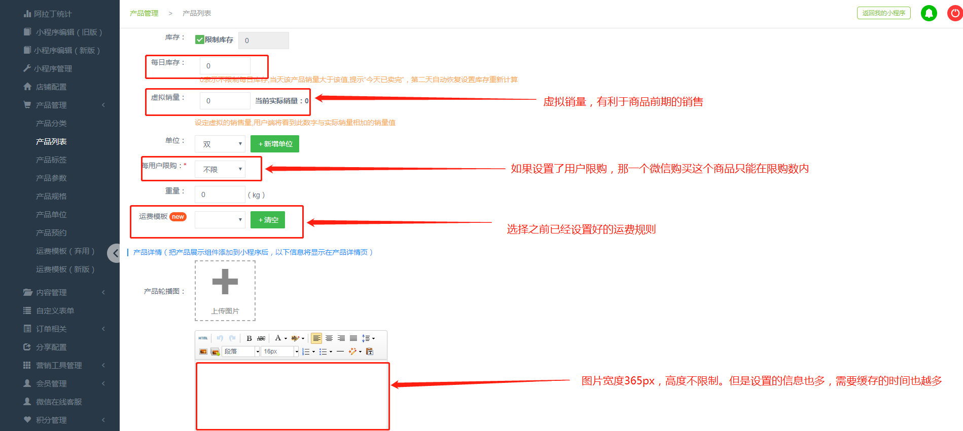 先设置(产品分类、产品标签、产品参数、产品规格、产品单位)-------------再在产品列表设置具商品信息------------最后设置运费模板