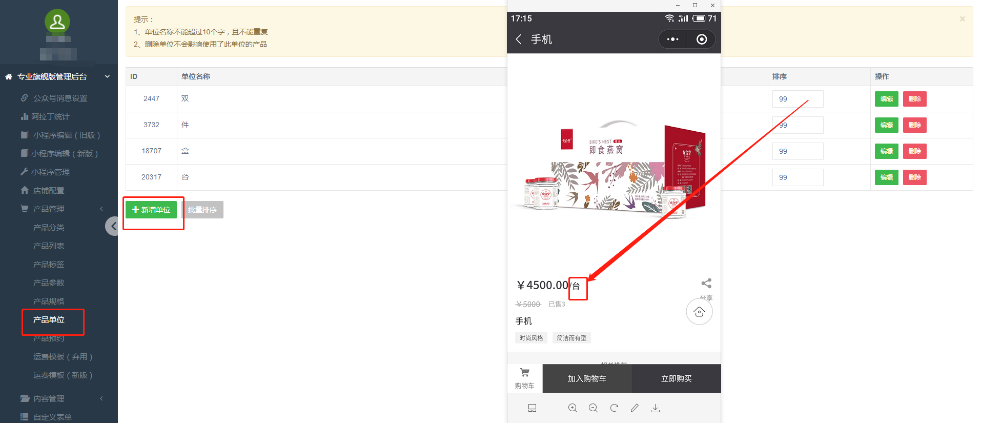产品的单位,一双鞋,一件衣服,一台手机。这个“双”“件”“台”即使产品单位。设置显示产品价格后面