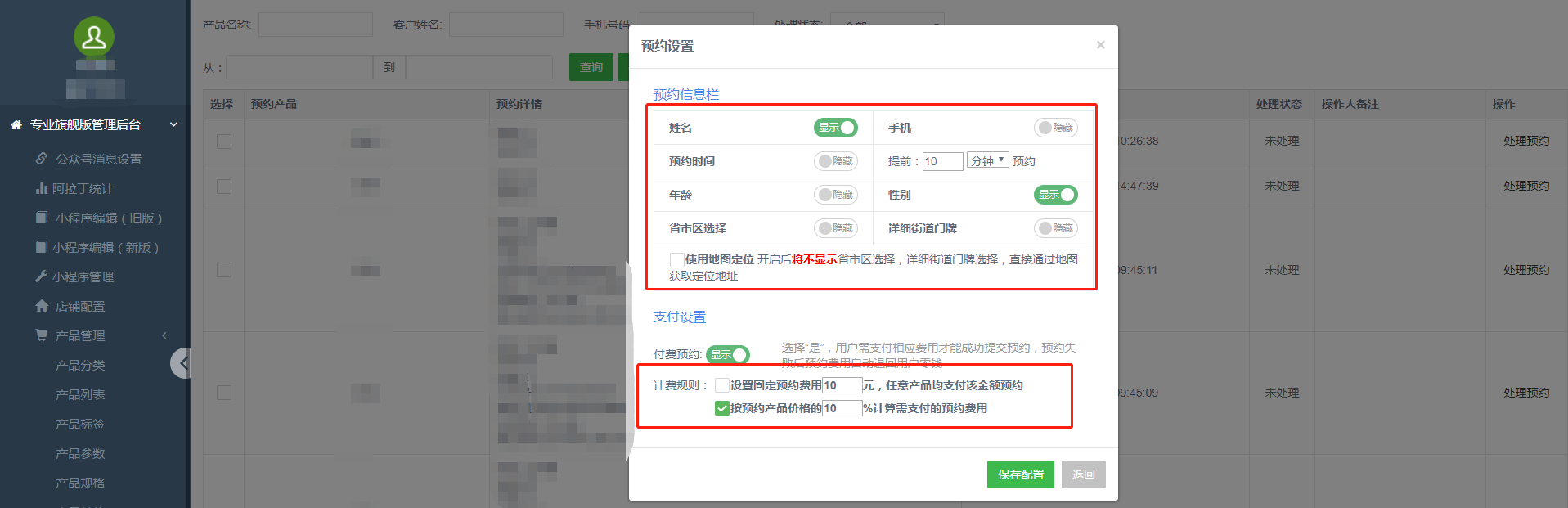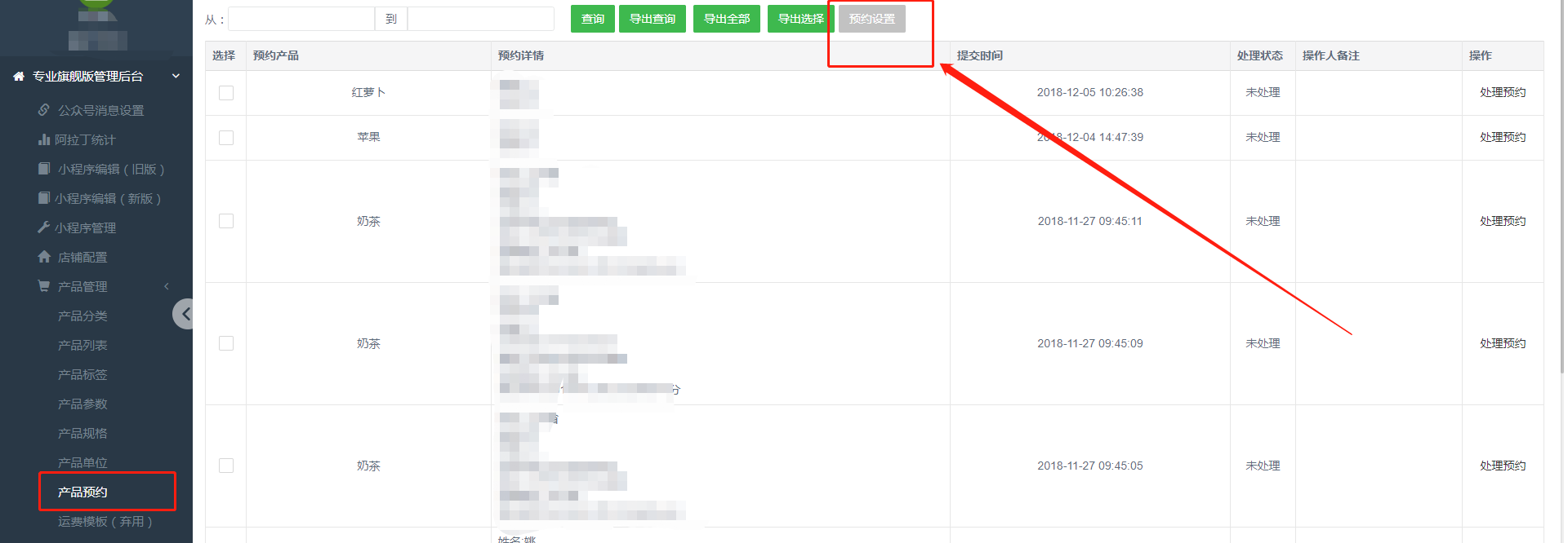 我们的产品可以设置是免费预约、付费预约还是购买,如果你在产品组件那里选择了预约,所有产品预约订单都是显示在“产品预约”这里