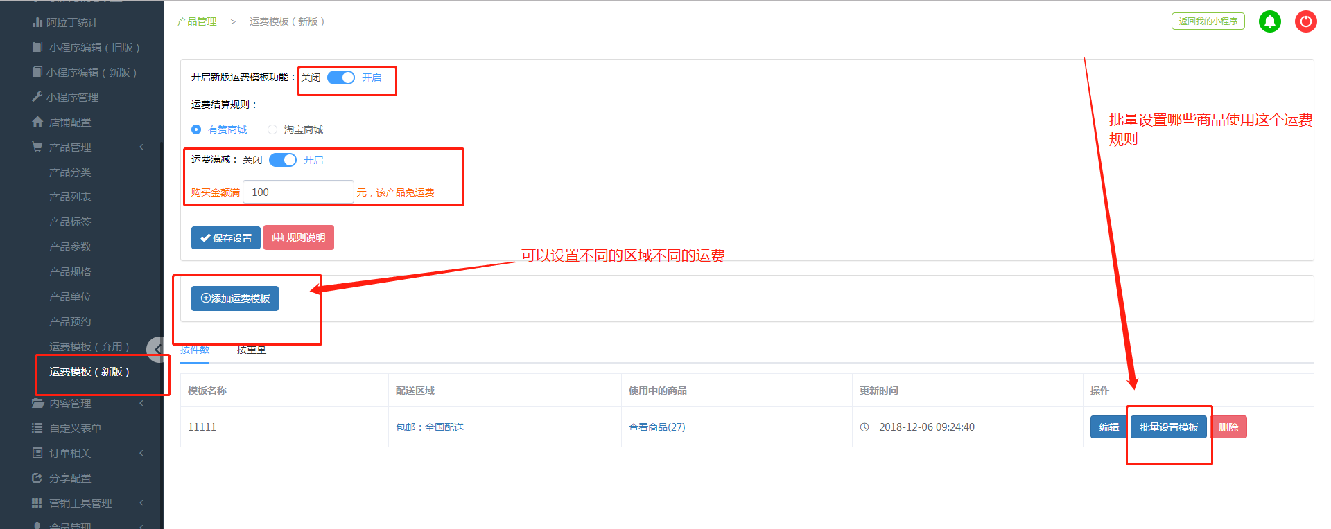 新版运费功能是对原来启用运费模板的细分,功能更强大,可以设置不同的商品使用不同的运费规则。一个商品可以设置不同的区域使用不同的运费规则,也可以设置满减。(在设置好规则之后,可以批量设置哪些商品使用这条运费规则。也可以产品编辑界面单独选择)