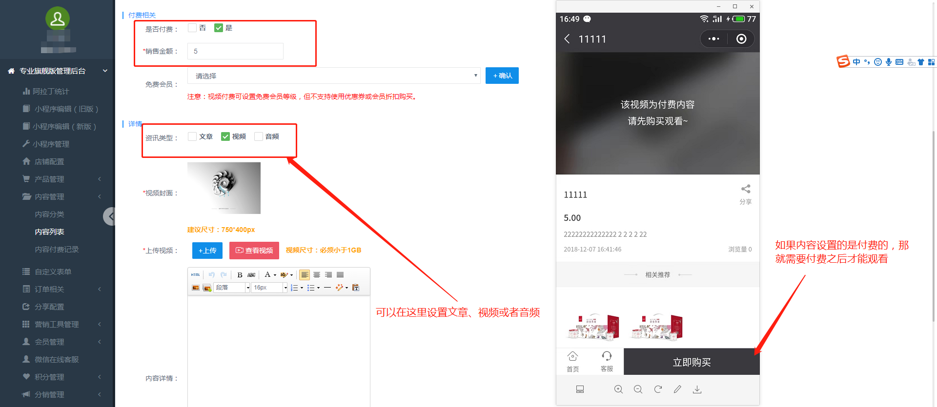 内容资讯内容可以设置文章、视频和音频付费观看。如果设置了付费观看,别人进入资讯就需要付费才能看到具体内容