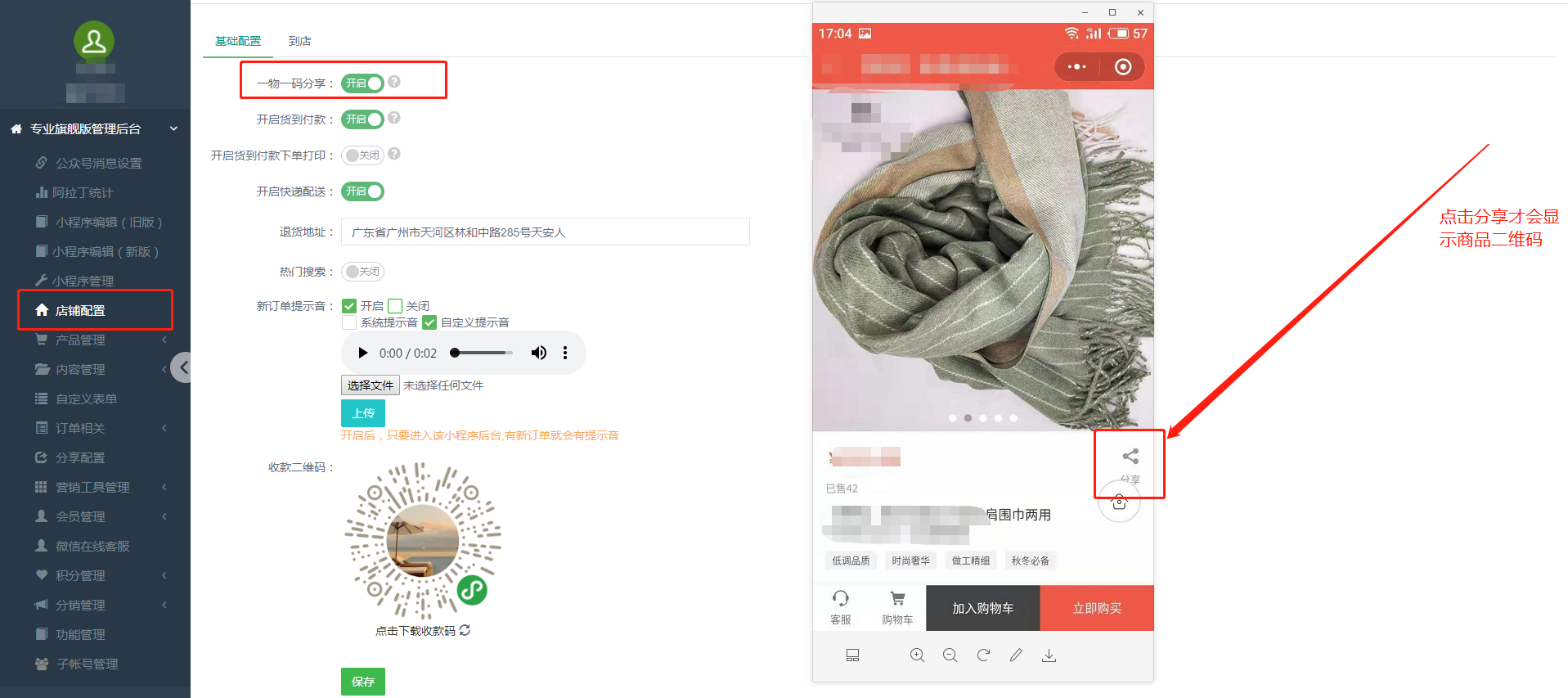 想得到每一个商品的二维码,就需要使用一物一码功能。后台一物一码那里操作开启,在小程序商品详情页操作分享就可以得到二维码,二维码可以保存到手机再分享到朋友圈