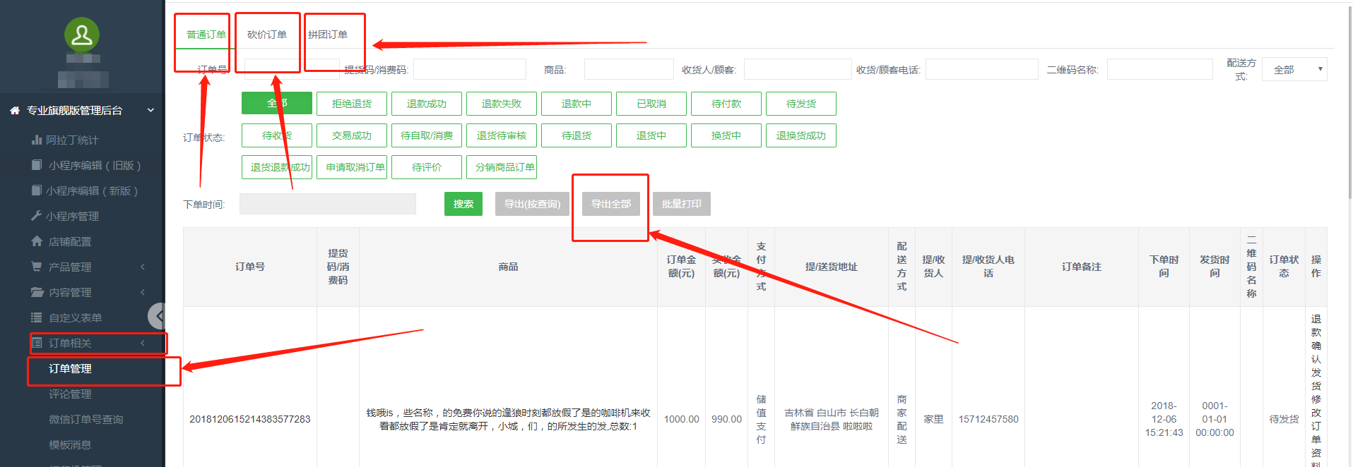 1、订单管理 后台: 订单管理系统分3大模块:普通订单、砍价订单、拼团订单 功能:均可操作查询订单,订单状态,导出订单