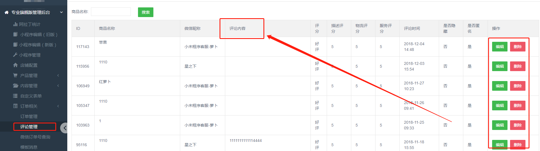 订单管理:客户下单之后确认收货可以操作商品评价,商家可以在后台那里操作回复、隐藏显示或者删除