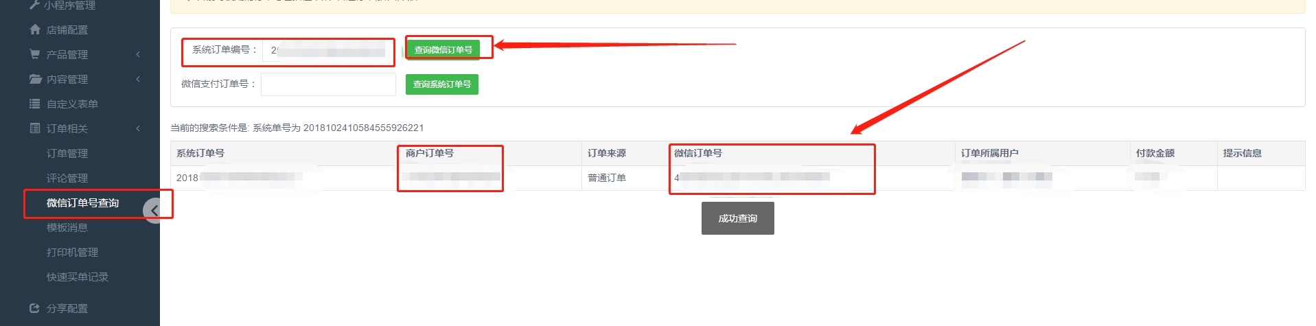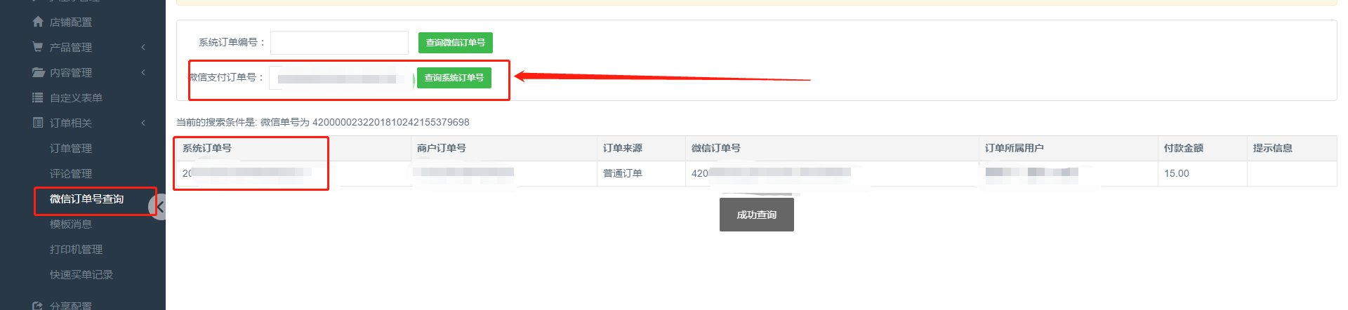 可以通过我们后台的系统订单号查询对应微信订单号,也可以通过商户号后台的微信订单号来查询对应我们后台的订单