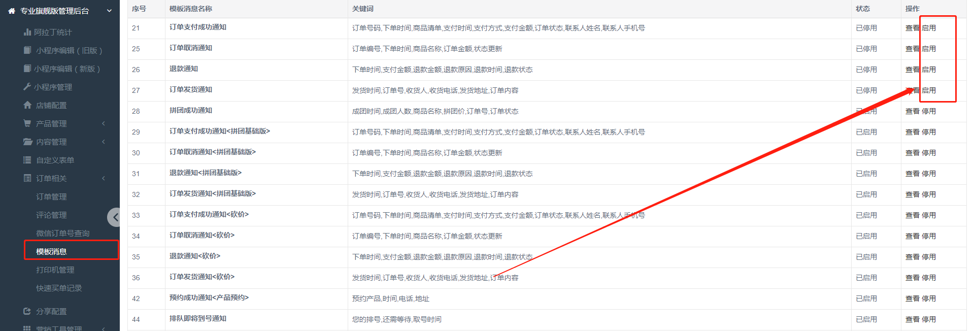 模板消息这里建议全部操作开启,这个功能是为了当有客户在这个小程序上面下单,商家可以在微信公众号“小未科技”那里接受订单信息,以便通知商家及时发货