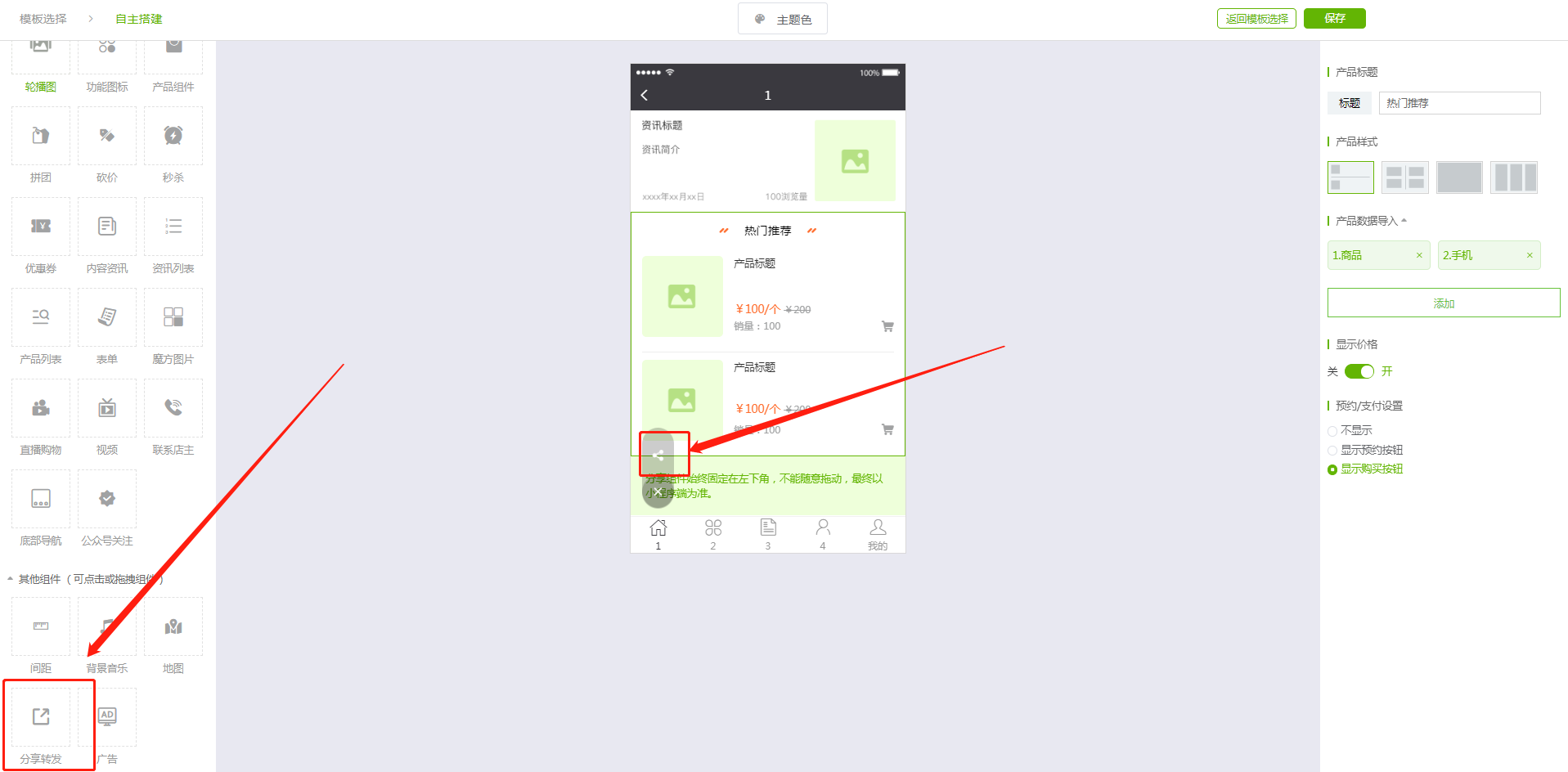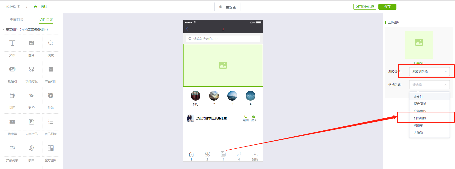 1.新版编辑界面图片功能、图片导航或者底部导航功能-----------选择跳转到功能------------选择扫码购物