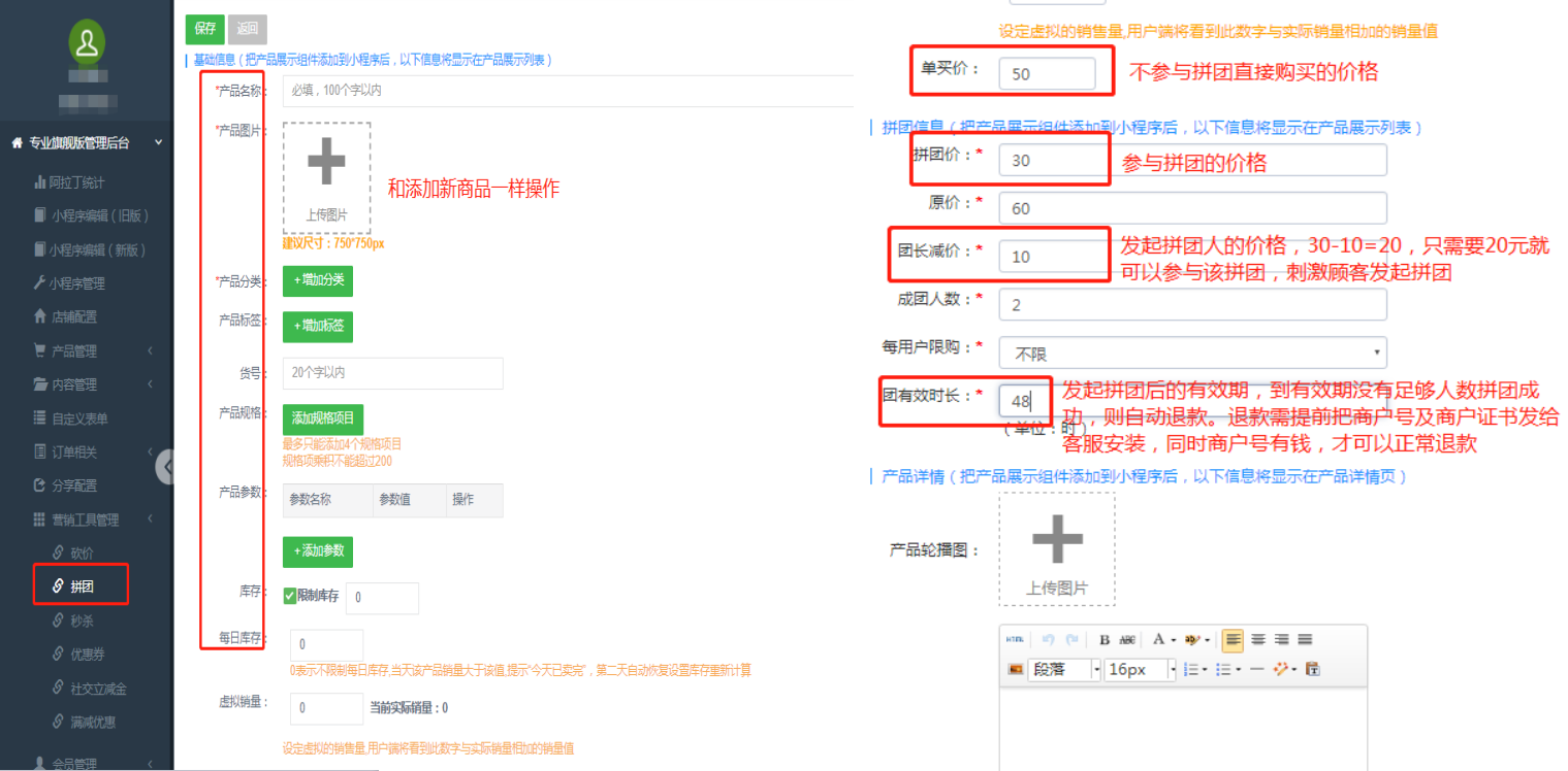 产品列表这里就是去设置具体的商品信息,在设置的过程需要去选择使用之前已经设置好的信息(产品分类、产品标签、产品参数、产品规格、产品单位)