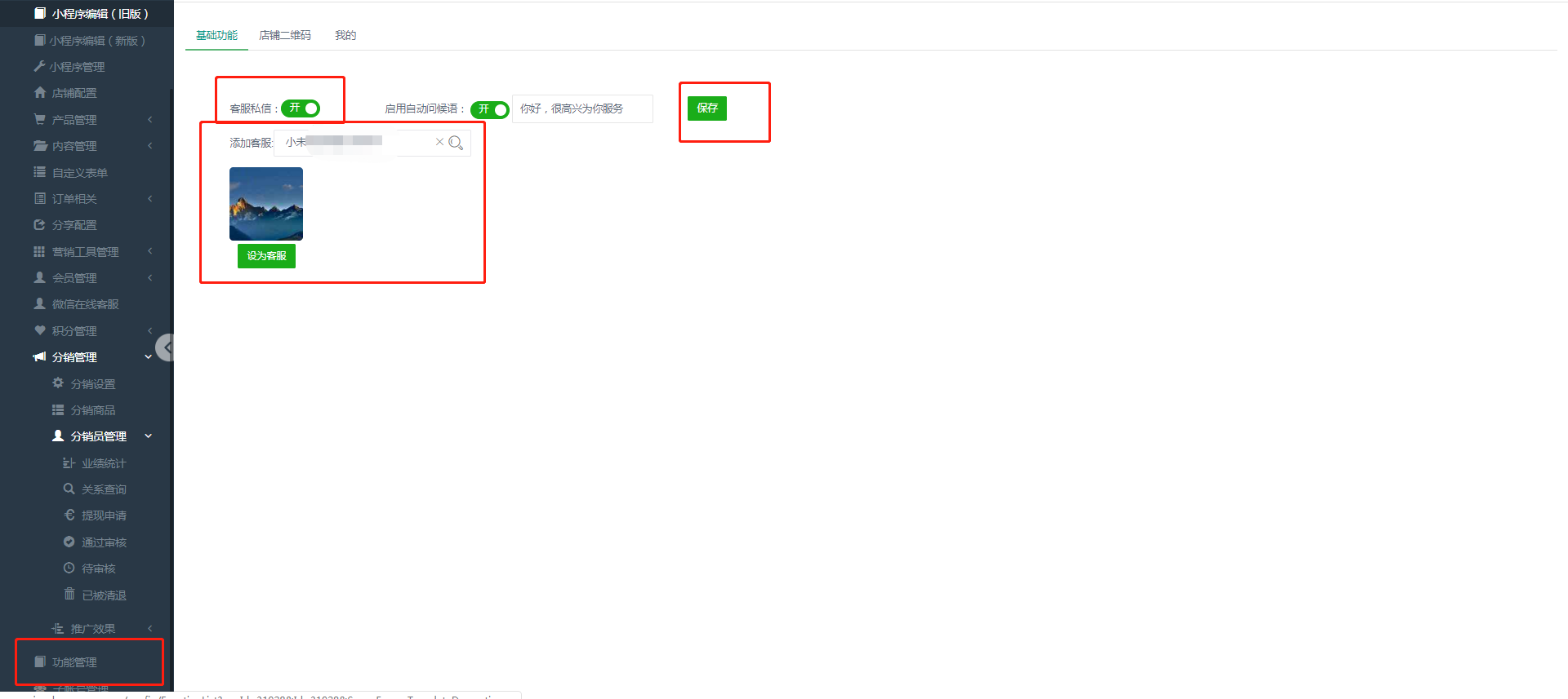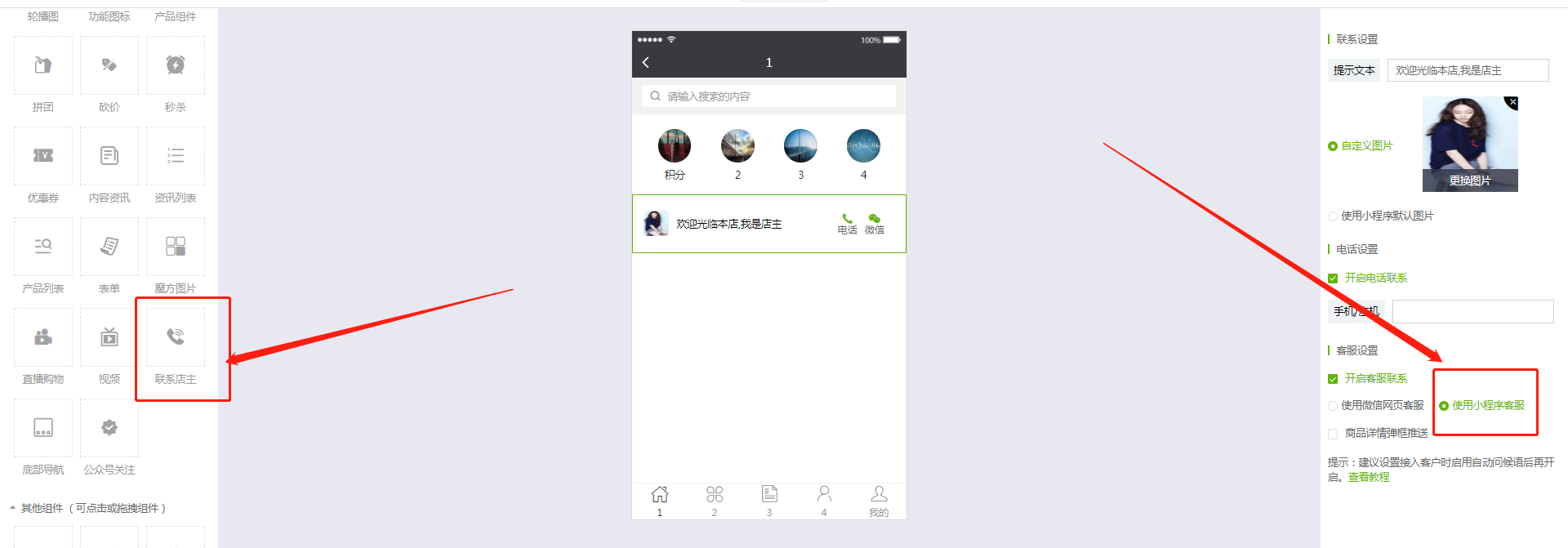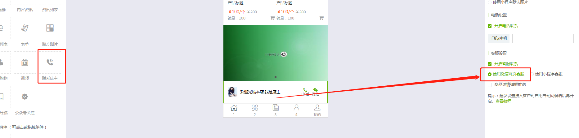 操作:操作开启私信,并在下面设置好接受消息的客服微信号名称,这个微信号必须先成为会员才能设置成客服(会员名称可以在会员列表那里查询)。之后再去新版编辑界面添加“联系店主”组件 ,在组件那里选择“小程序客服”