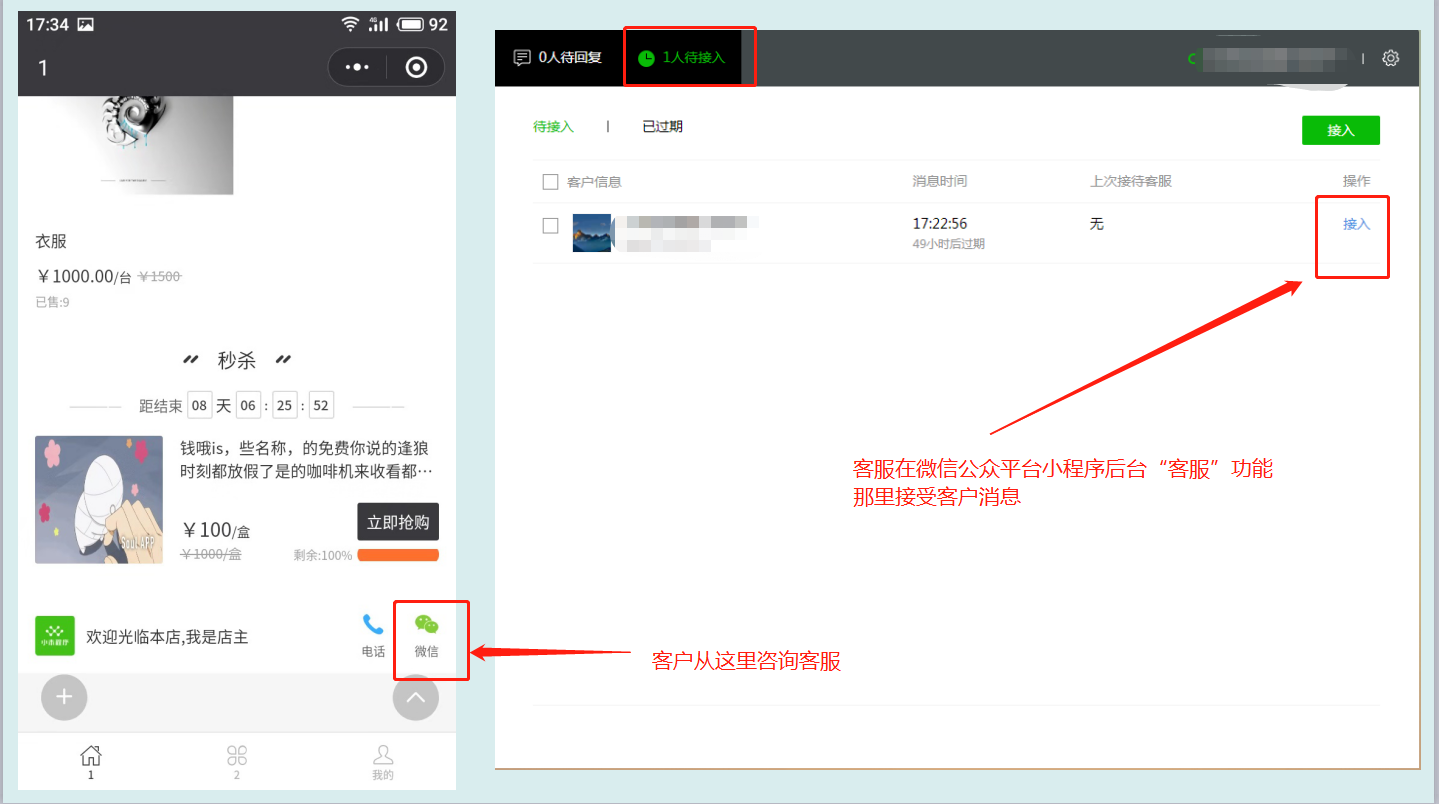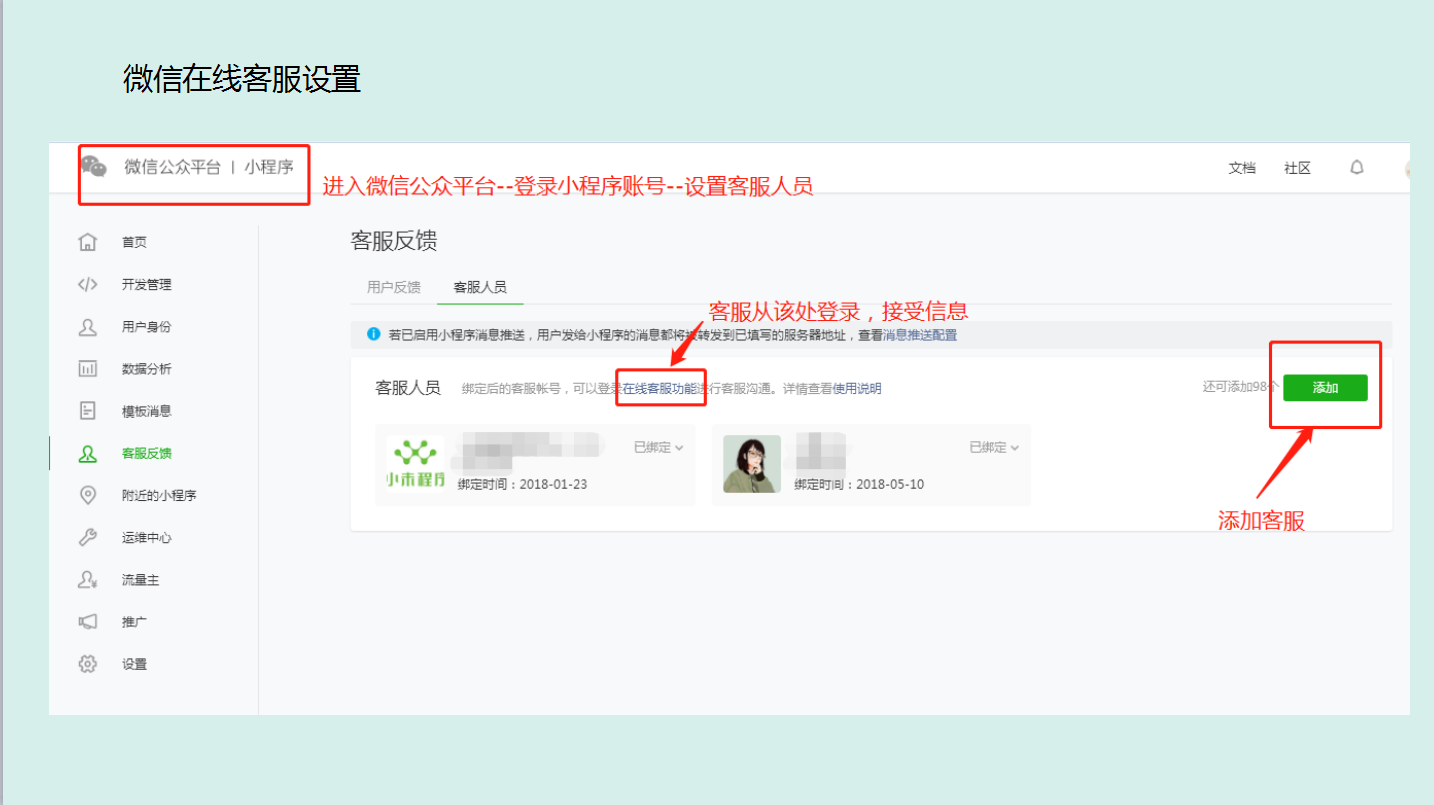 微信网页客服是在微信公众平台小程序后台客服反馈那里接受客户发送的消息