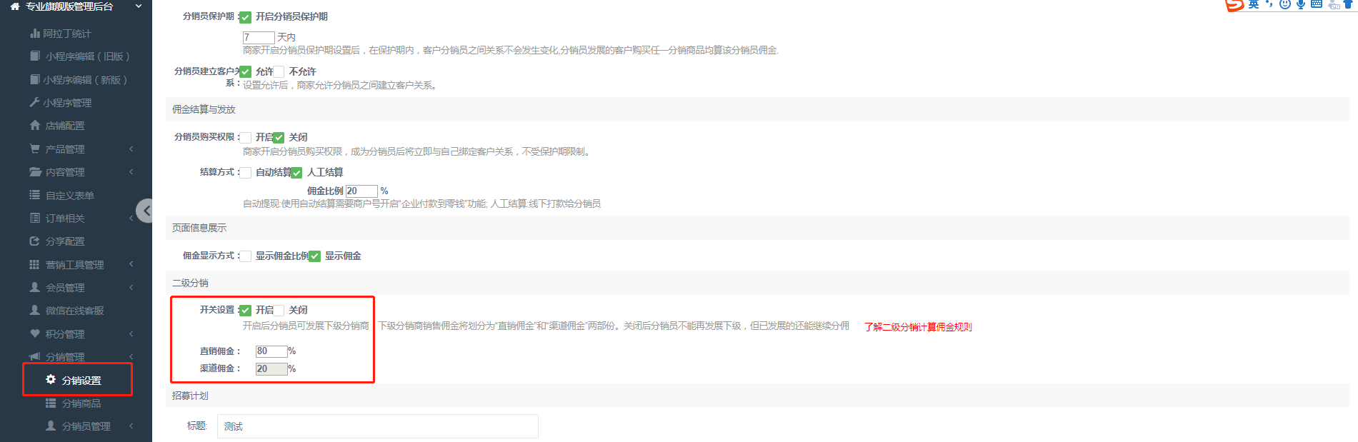示例2:(开启二级分销,直销佣金为80%,渠道佣金为20%)